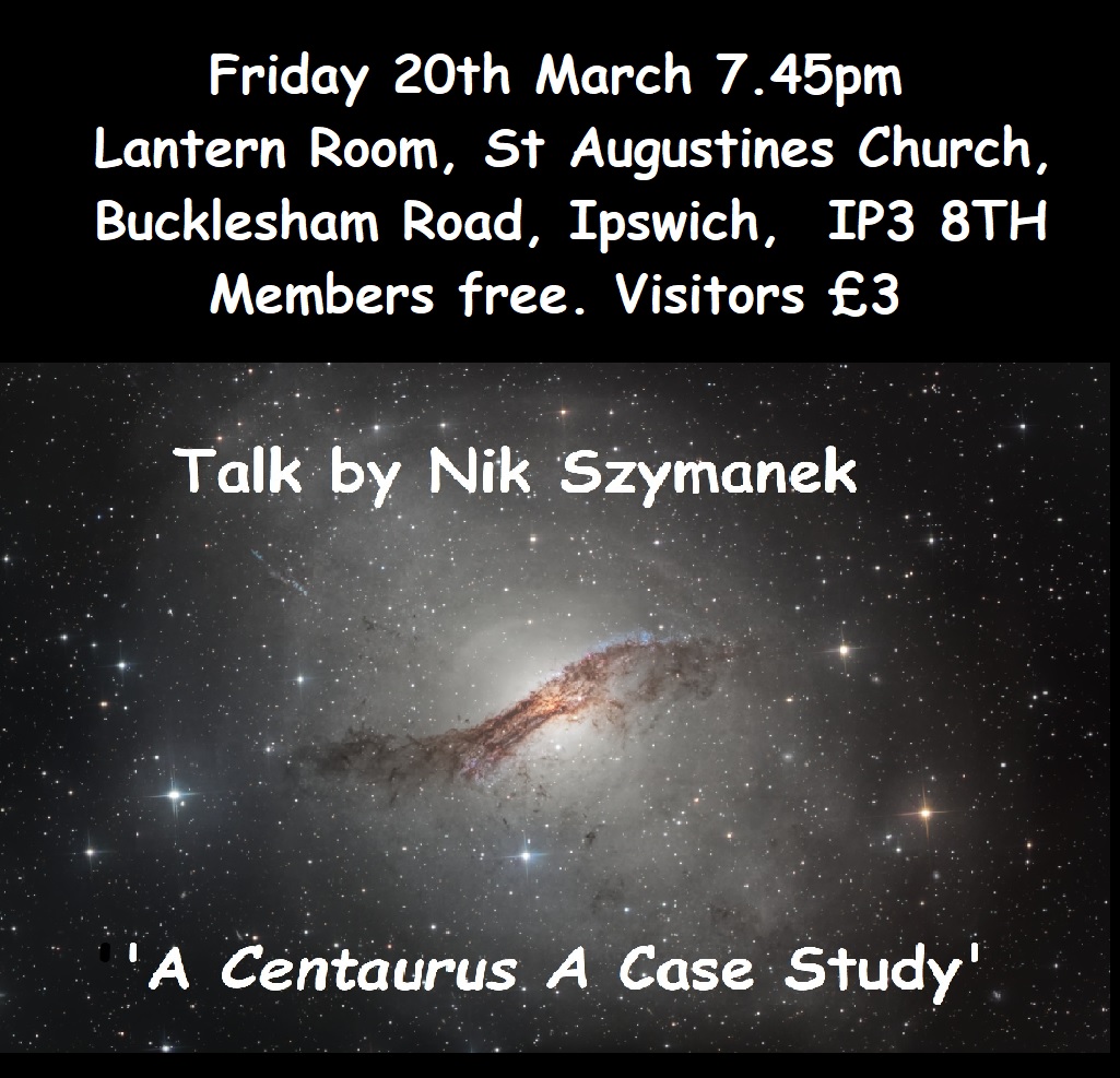 A Centaurus A Case Study. Nik will demonstrate, using the Centaurus A galaxy as a case study, how to make amazing astro-photographs. He will also showcase powerful new imaging software which will be of particular interest to astrophotographers. There is parking at the front of the church and additional spaces just across Bucklesham Road at the Saint Augustine's Community Hub.