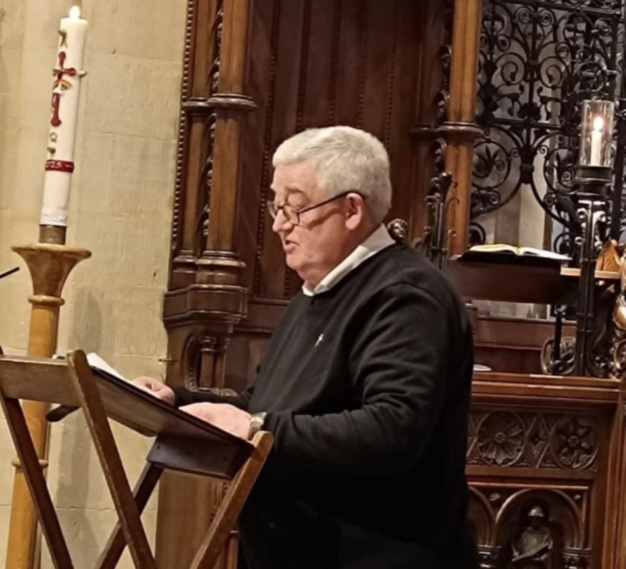 The bell of Great Tom sounded two beats just before the coffin containing Allan’s mortal remains entered. The coffin was decorated with a large floral display. The evocative words from verses 25 and 26 of chapter 11 of St John’s Gospel (I am the resurrection and the life...) were read and the coffin proceeded through the nave and was placed on two biers just below the choir.