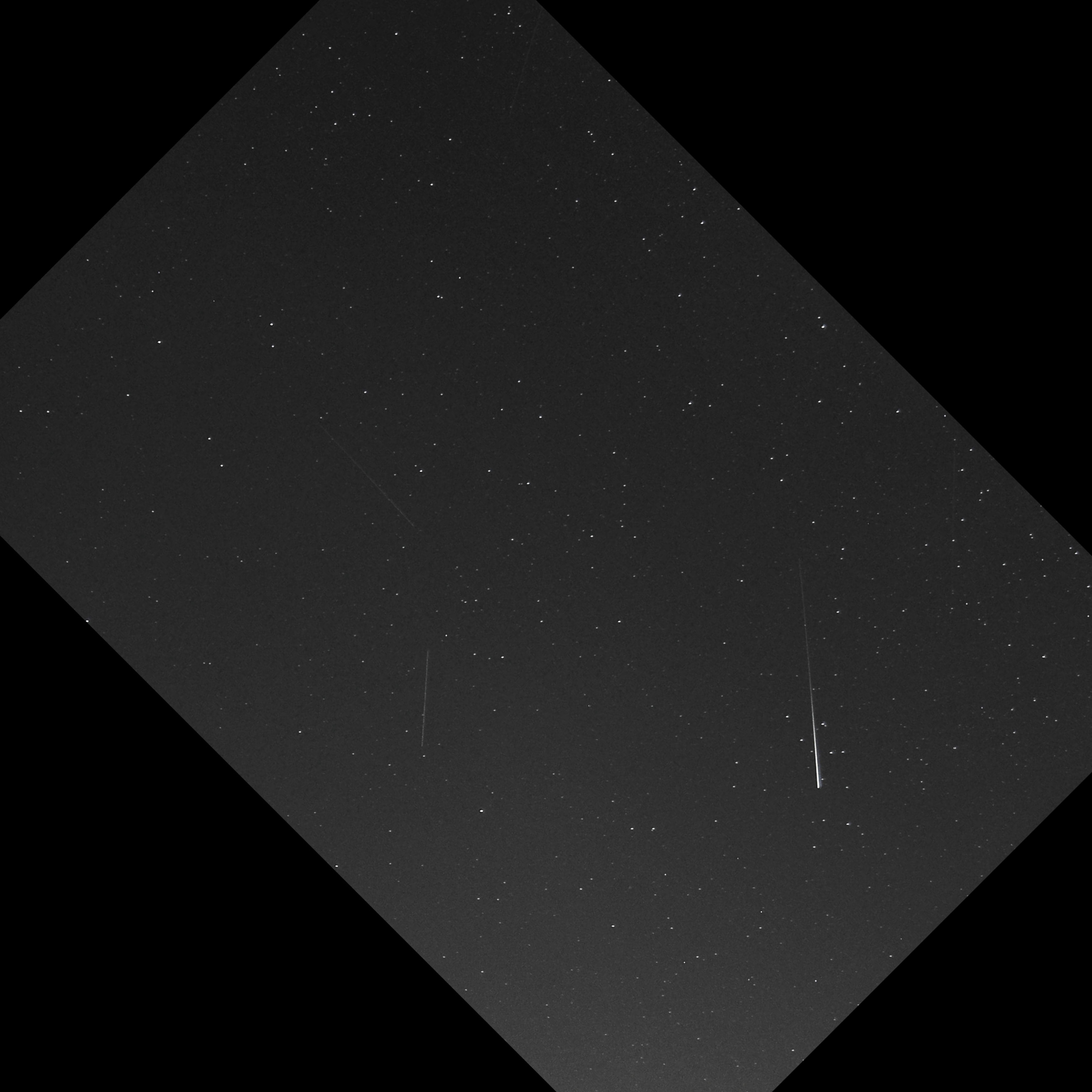 21:20 UT, Canon 1100D camera with 14 mm Samyang lens on a barn door mount. 360 second exposure, ISO 800, f2.8. Three satellites are visible! Light pollution limited the capture of faint stars. The satellites are: