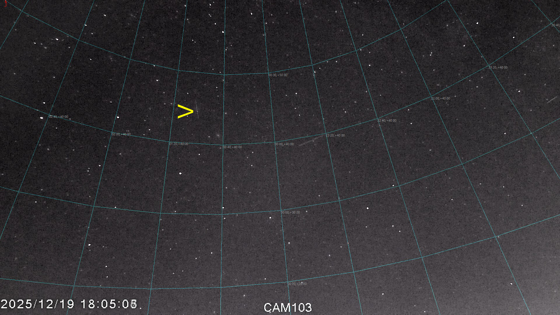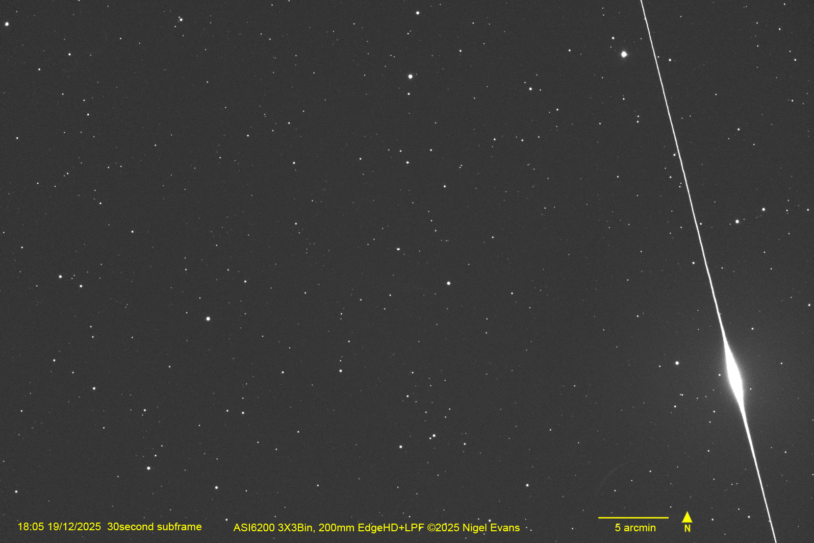 During efforts to record comet C/2025 K1 (ATLAS), at 18:05:06 UT on 19 December 2025 I recorded a glint from a satellite in the field of view of my telescope (200 mm Celestron Edge HD. (The comet is present in the image too, but required a stack of multiple images to be seen.)