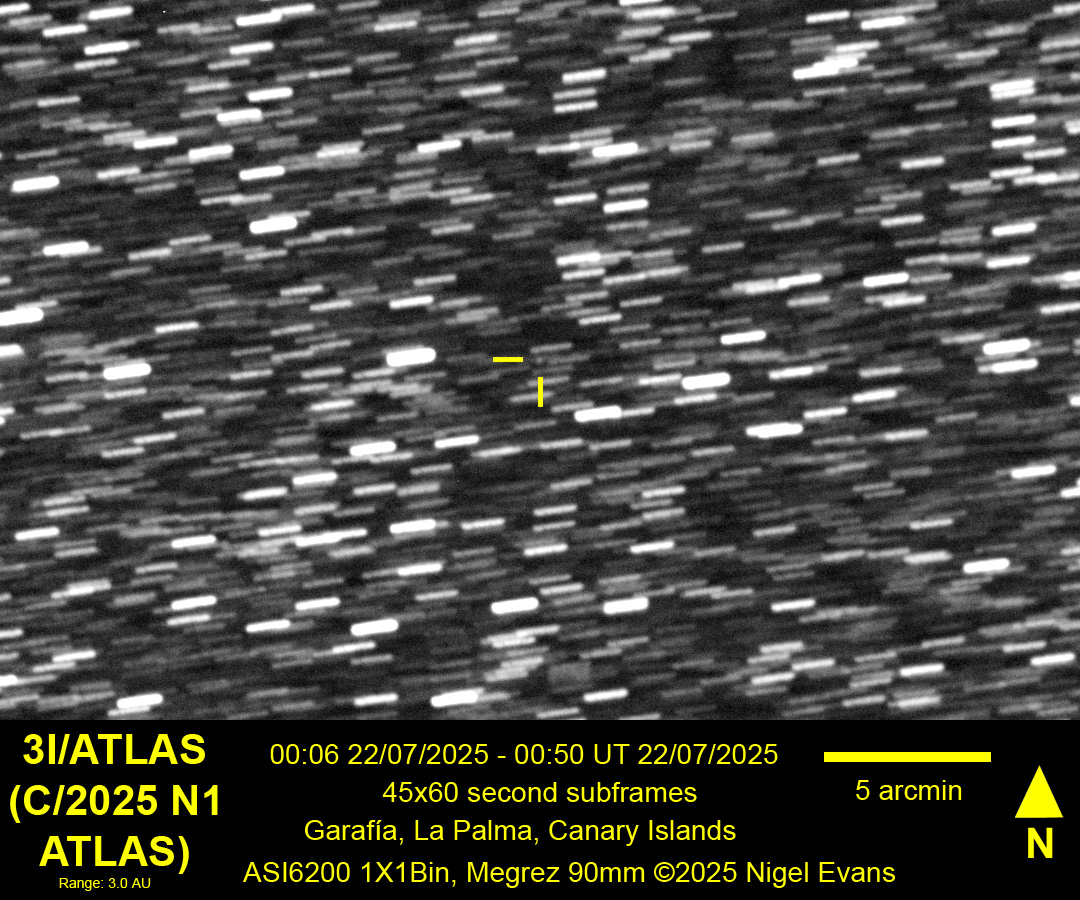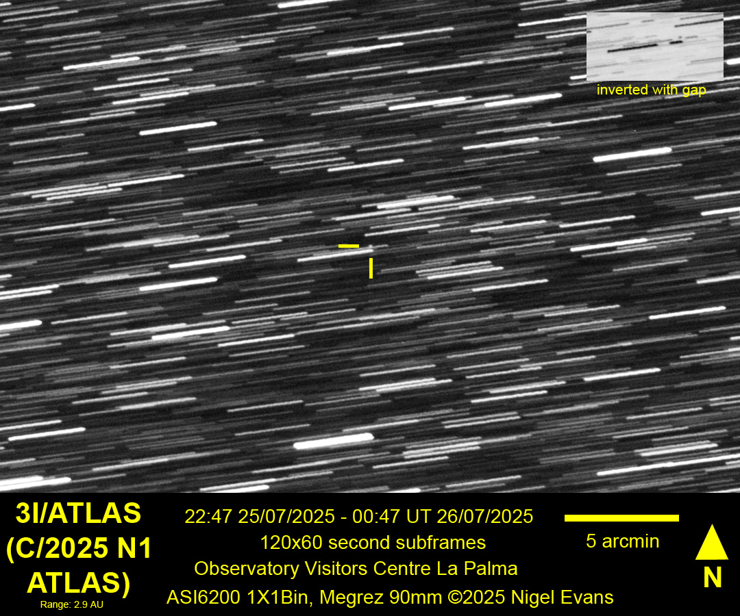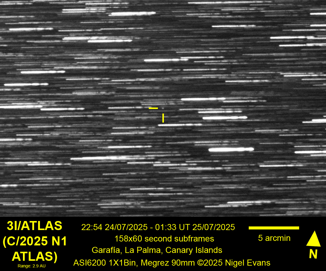 The ATLAS (Asteroid Terrestrial-impact Last Alert System) survey telescope in Rio Hurtado, Chile, first reported an observation of comet 3I/ATLAS on 01 July 2025. (Subsequently, "pre-discovery" observations were found as far back as 14 June.) The object is the third known interstellar visitor to the Solar System (following 1I/Oumuamua and 2I/Borisov) and is a little different to its predecessors. The first two were predominantly rocky or asteroidal, whereas 3I/ATLAS is more gassy or comet-like. As it draws nearer to the Sun it is expected to develop a tail, but it is unclear whether the tail will be bright enough to appear in a modest telescope. The object is expected to attain peak magnitude around the end of November 2025 (fortuitously, this coincides with the best time to view it from the UK), and predictions of its peak magnitude have ranged from an initial estimate of 11.5 to an estimate in late summer of 14.5.