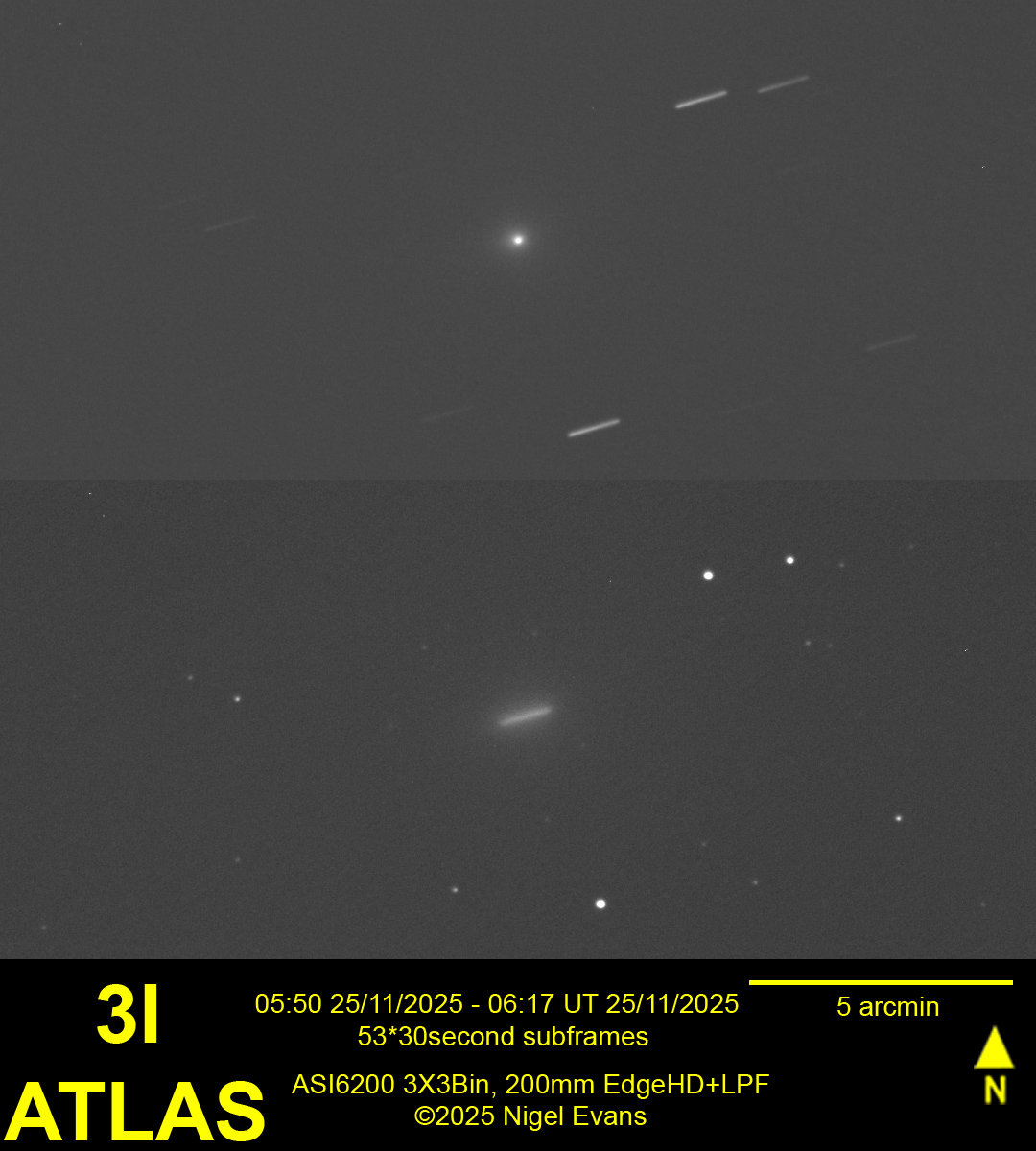 To me, comet 3I continues to exhibit a bright nucleus at about magnitude 12.5 and nothing else, as shown in the image below. However on the BAA website is an image taken at approximately the same time, from rural Spain, showing considerable detail.