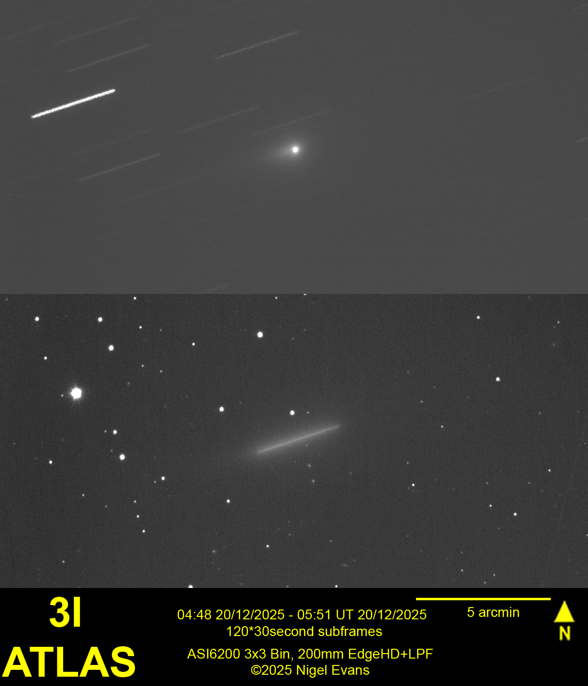 After much dismal weather recently, the morning of 18 November was clear and very cold! From my home observatory, the comet was visible in the twilight sky. Although it was approximately 100 times brighter than when I last observed it from La Palma in July, I did not expect to capture any detail of the tail that observers situated under dark skies have reported. The image below also captures asteroid 95 Pandora, moving across the sky in the opposite direction to 3I.