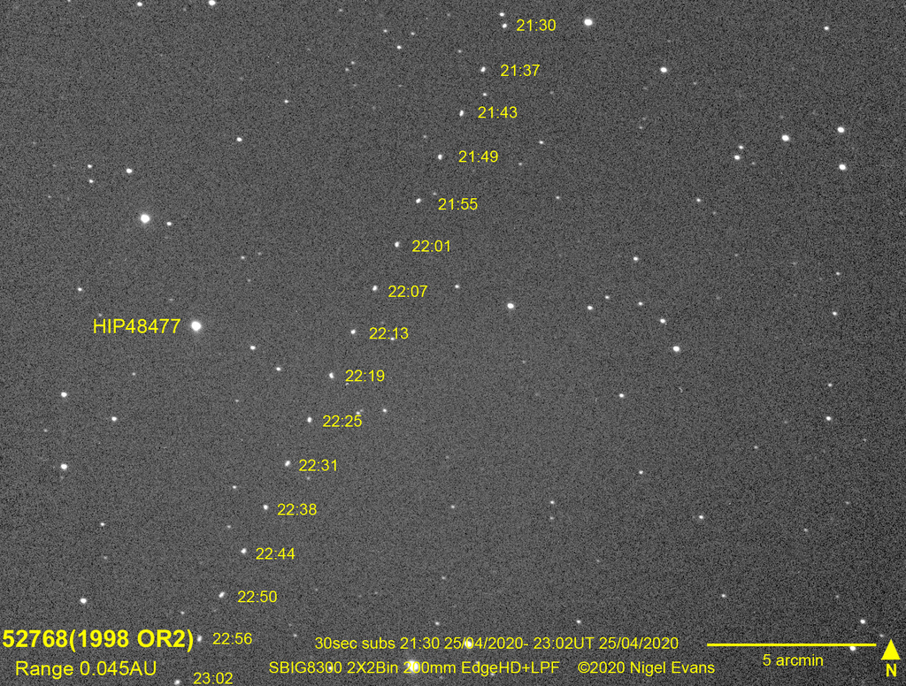 Near Earth asteroid (52768) 1998 OR2 passed about 6.3 million km from the Earth on 29 April 2020. The object is potentially hazardous on a timescale of thousands of years and is notable for its large size, at over 2 km diameter. On 25 April I imaged it in Sextans, at magnitude 11, moving south at over 14 arcminutes per hour (7 arcseconds in each 30 second exposure).