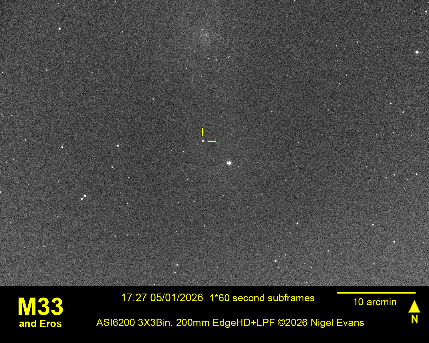 On 05 January 2026, asteroid 433 Eros (magnitude 10.8) swept past M33, the Triangulum Galaxy. I was alerted to the event by a piece on the BAA website. I started observing as soon as it was dark enough and followed Eros until its meridian crossing, at which point clouds rolled in!