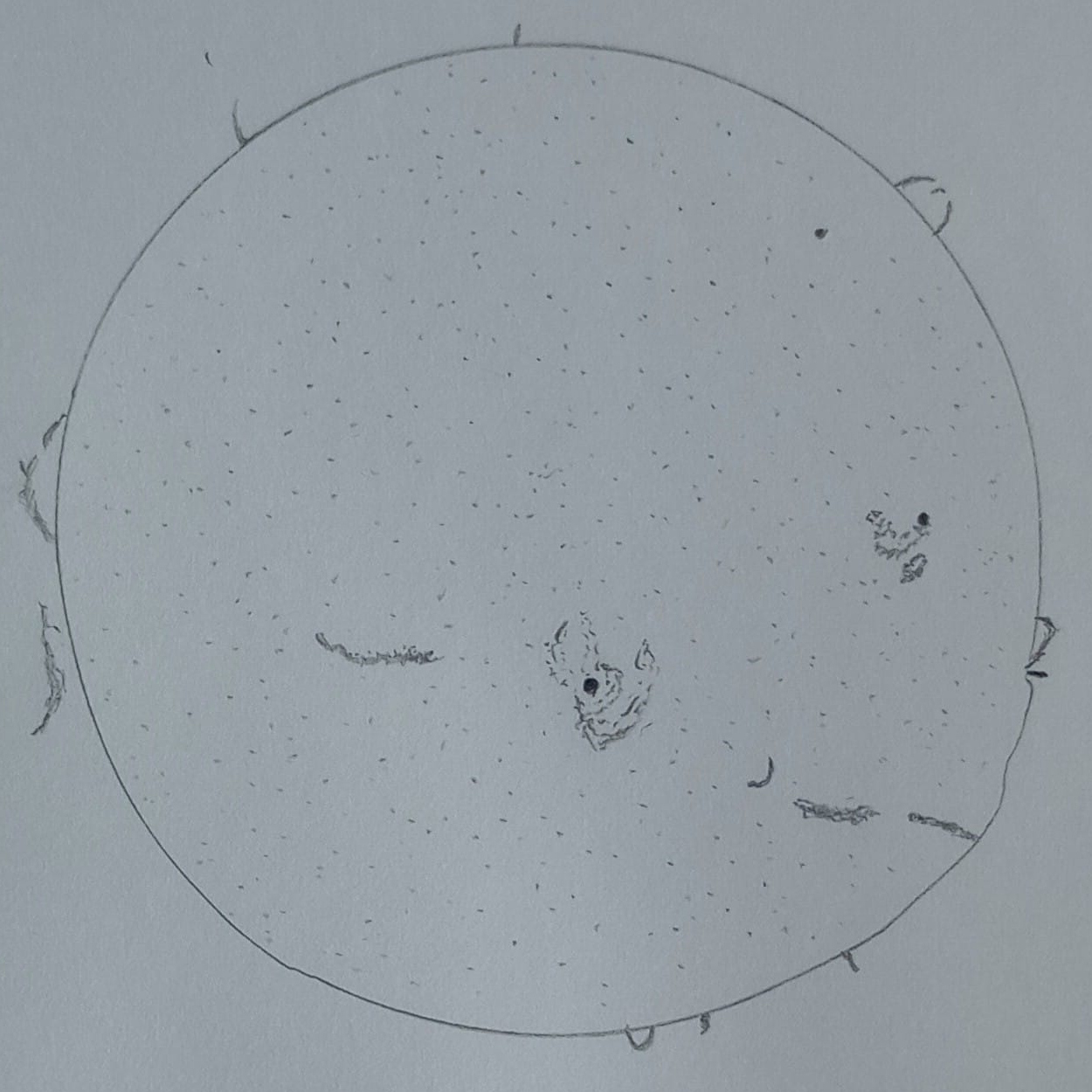 Below left is a sketch made at the eyepiece of OASI's Coronada PST on an alt-az mount, using a Baader Mk IV zoom eyepiece at 25 mm, providing x16 magnification. There are two impressive prominences at the 5 o'clock position.