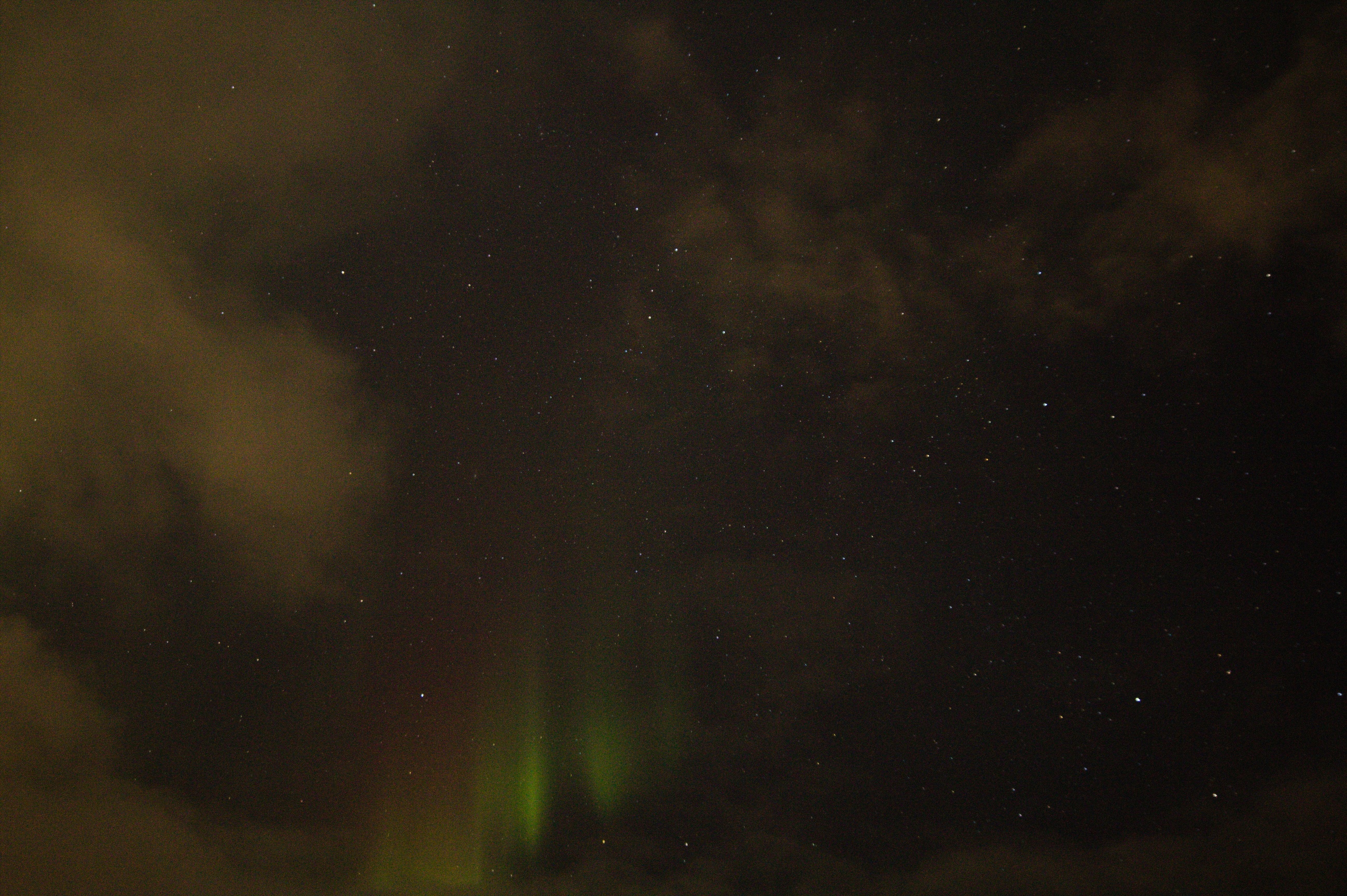 As time went by, we could start to see a greenish glow on the horizon in a gap below a band of cloud. More auroral glow appeared high in the north but it was partially obscured by cloud. The Pleiades were clearly visible in the east and appear in most of my photos.