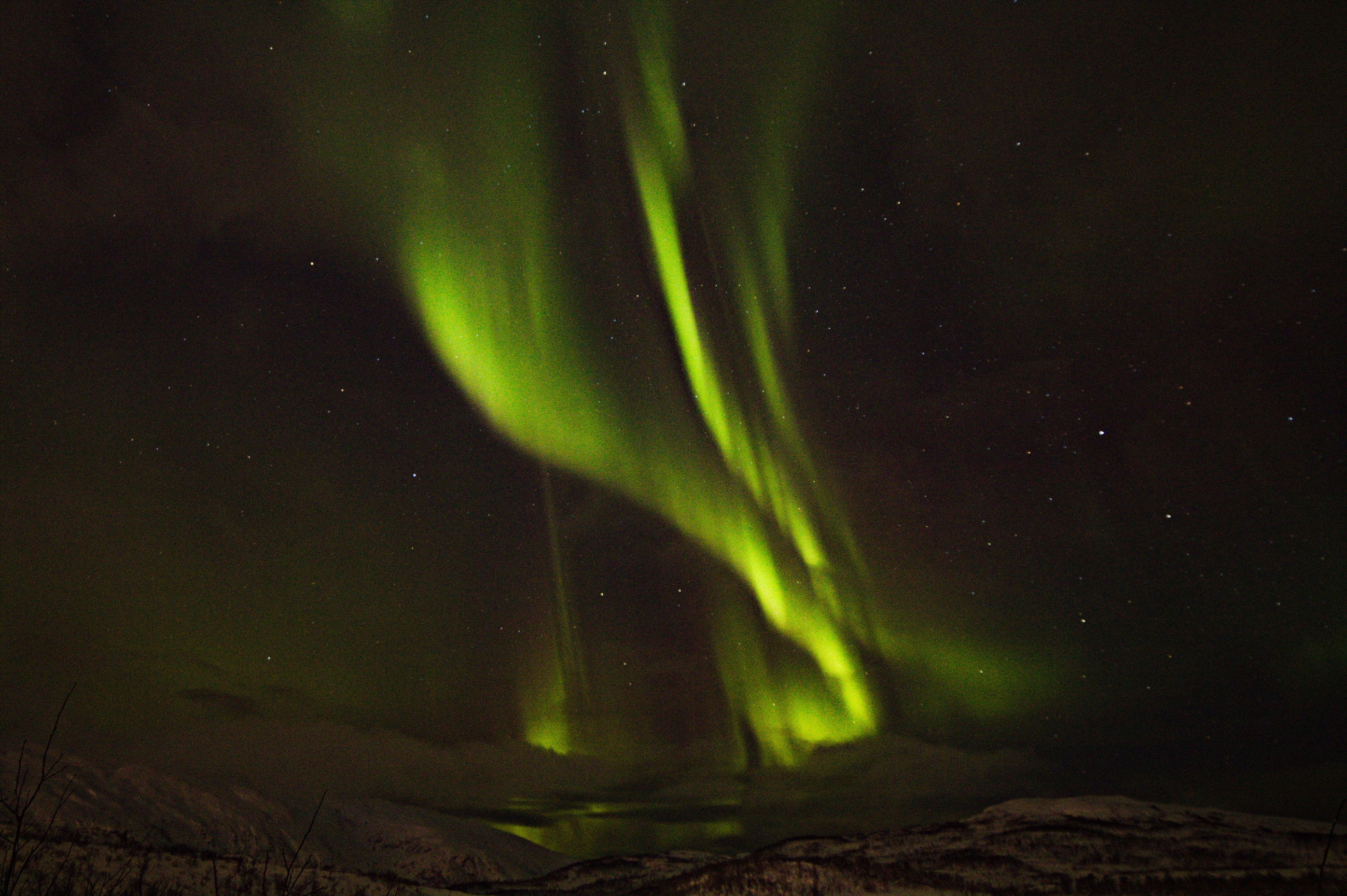 When we arrived, much to my surprise, there were a few clear patches overhead. I set up the camera and managed to get one shot of a miserable trace of green. Still, the reindeer soup and lefsa cake went down nicely. The temperature was quite pleasant at only just below freezing: when dressed in as many layers of clothing as I was, it felt positively balmy. There was intermittent snowfall: I couldn’t actually tell that it was snowing and only became aware of it when I noticed something odd with the pictures I was taking and, on checking the lens, found it was half-covered in snow! After a further two hours (a total of three hours on site) our guide decided to call it a day. As we had seen a small patch of aurora, the safari company would claim the night as a contributor to its 85% success rate. Mmm!