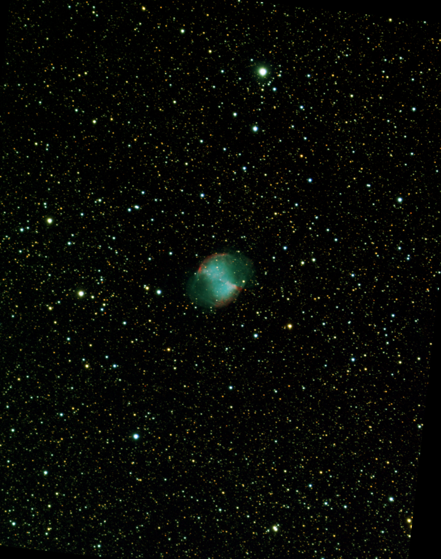 340 mm, f/4.0 Newtonian telescope and MX916 CCD camera. The object is a dual-lobed planetary nebula lying in the constellation Gemini. Note the unusual double structure with faint wisps at a considerable distance from the central aggregation.