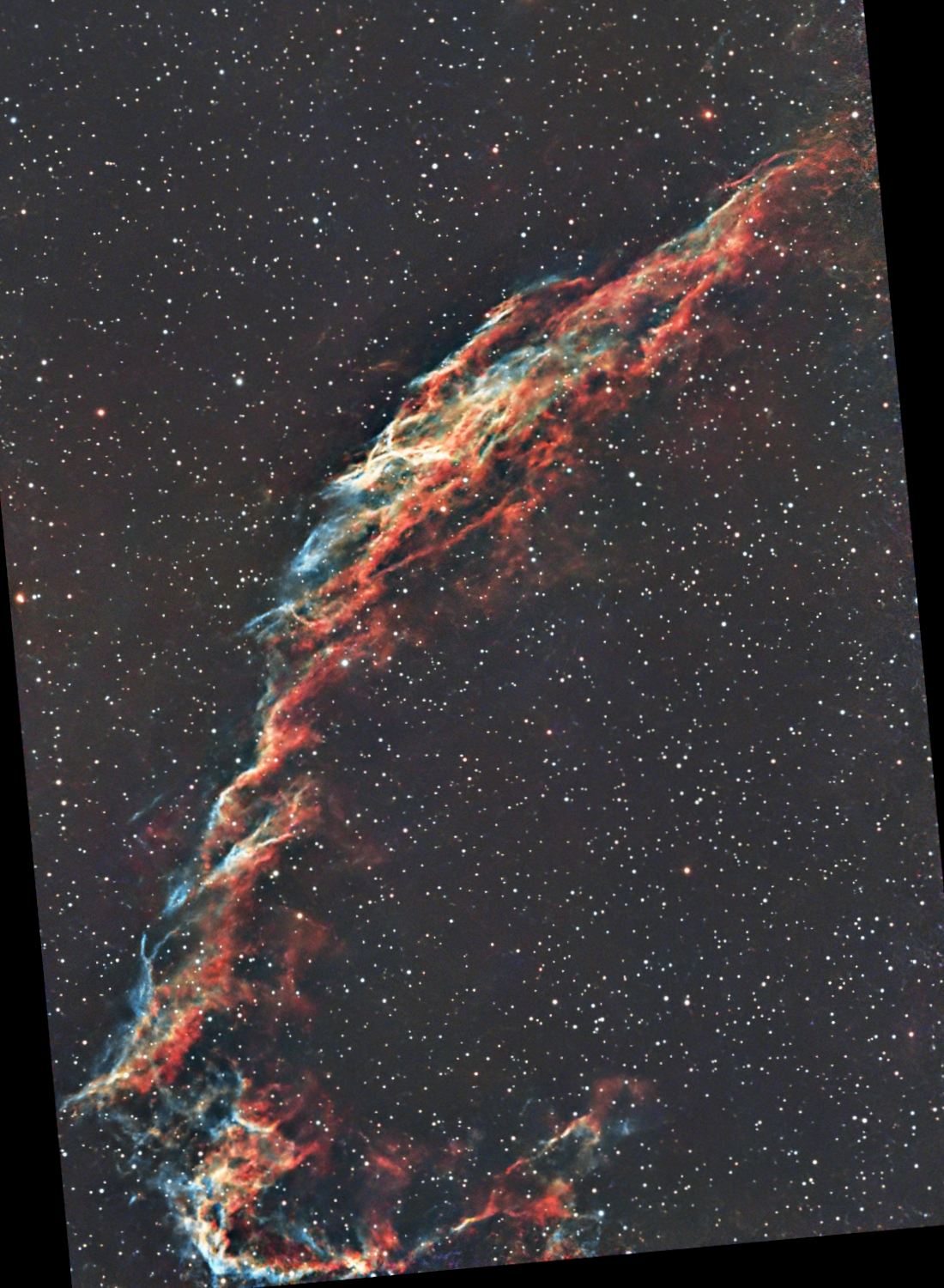 The entire Veil Nebula. William Optics ZS71 ED 71 mm, f/5.9 refractor on HEQ5 mount. Fifteen 480 s exposures at ISO 800. Image captured at Haw Wood star party.