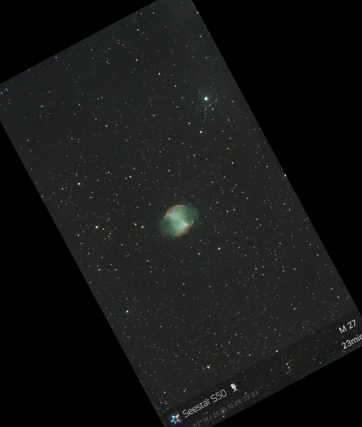 Seestar S50 "smart" telescope. An 11-minute stacked exposure comprising 66x10 s frames. Post-processing via a Motorola G31 smartphone camera app.