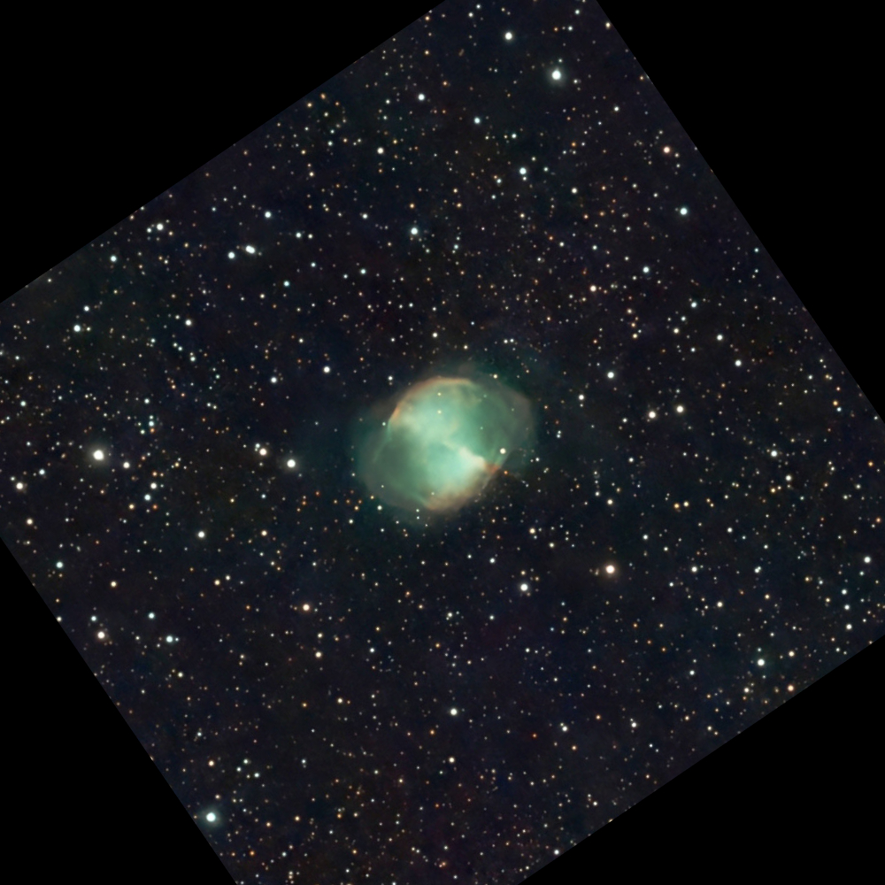 Skywatcher 190 mm Maksutov-Newtonian on NEQ6 mount. Canon 60Da camera. Two 480 s exposures at ISO 400.