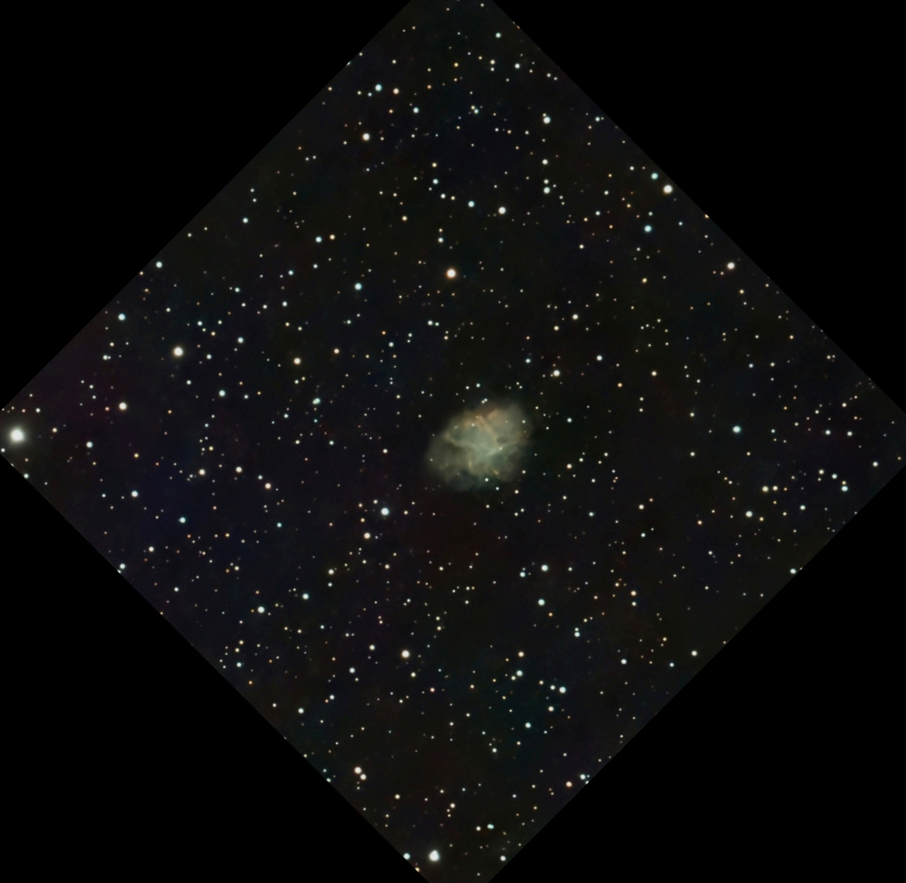 Skywatcher 190 mm Maksutov-Newtonian on NEQ6 mount. Canon 60Da camera. Ten 360 s exposures at ISO 800. Processed in DSS and Gimp. Magnified image.