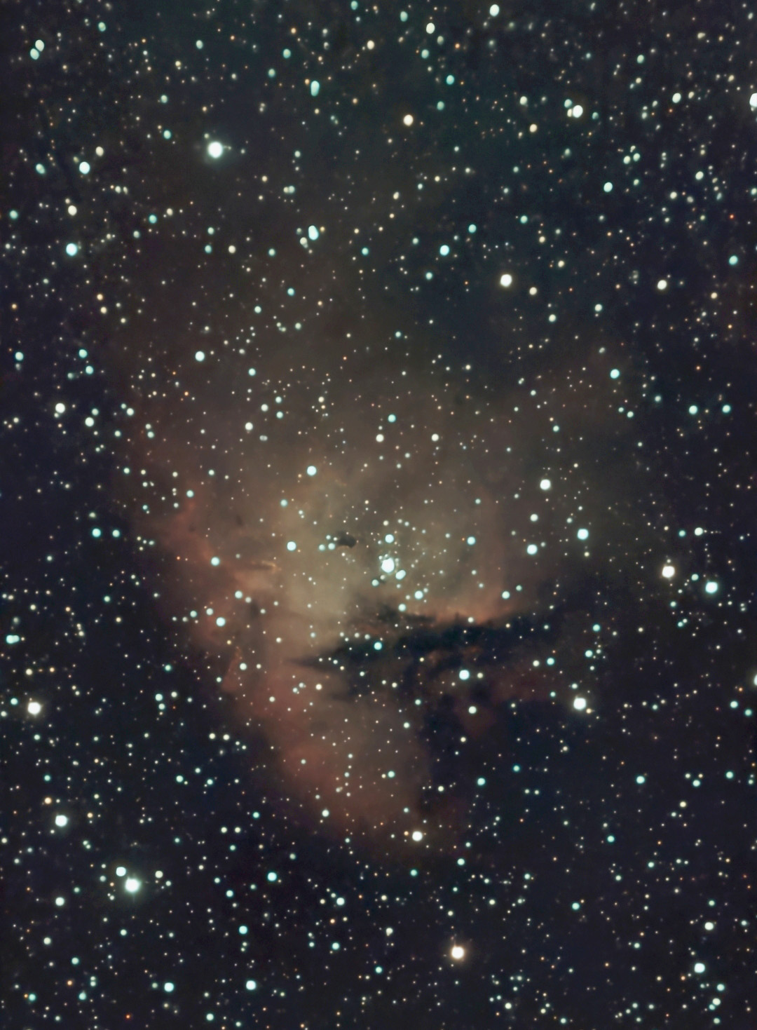 Skywatcher 200PDS 200 mm, f/5 Newtonian on NEQ6 mount with Canon 60Da camera. Five 360 s exposures at ISO 400. Note the so-called Christmas Tree Cluster in the middle of the nebula.