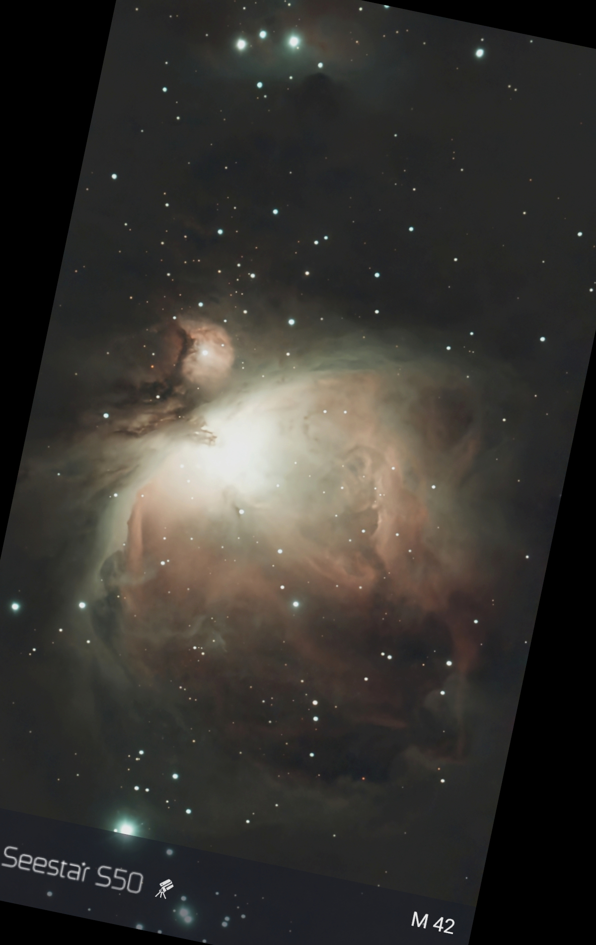 Seestar S50 "smart" telescope, used in panoramic mode to capture the whole area of M42 and M43. Twenty minutes of 10 s frames.