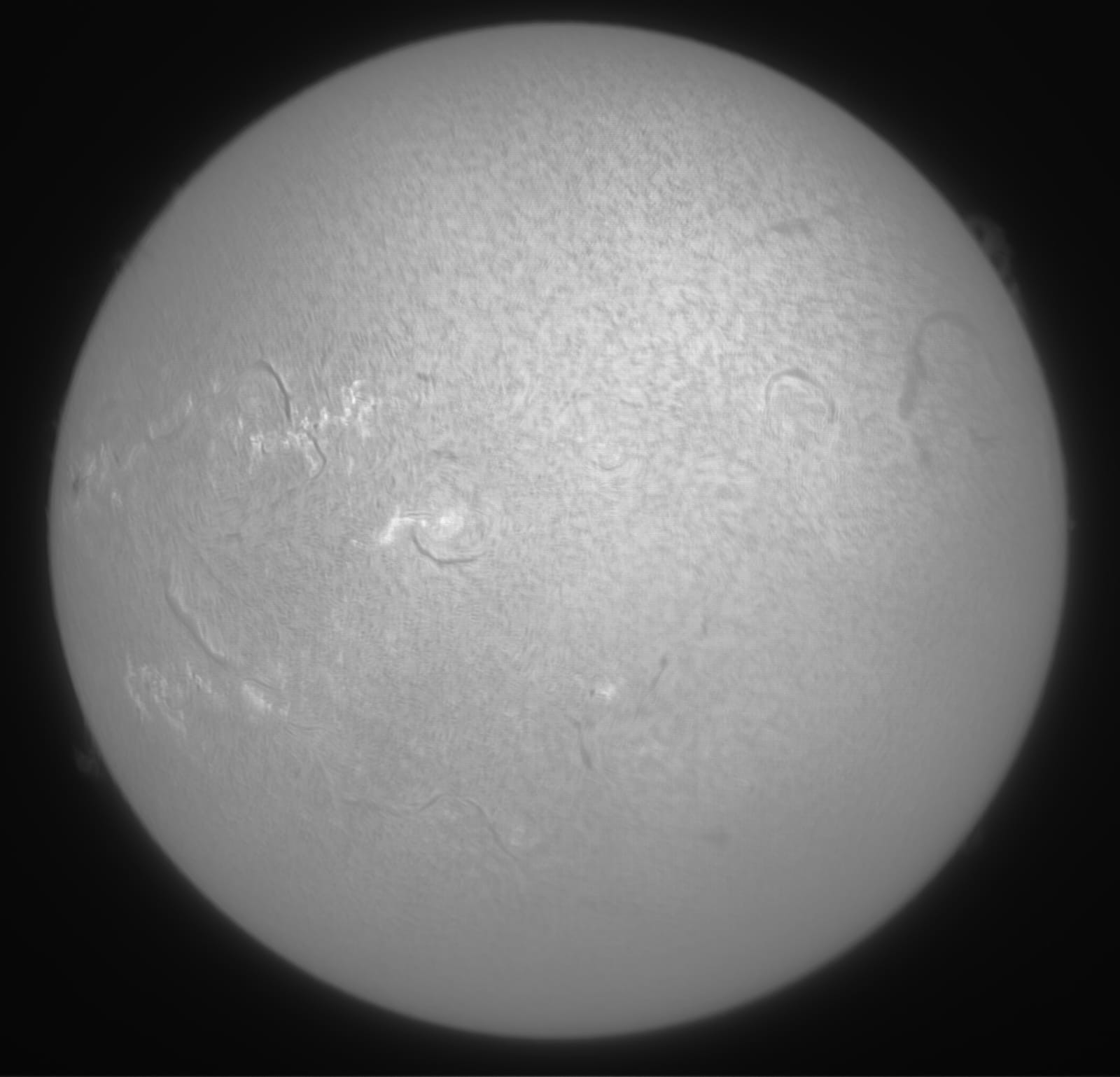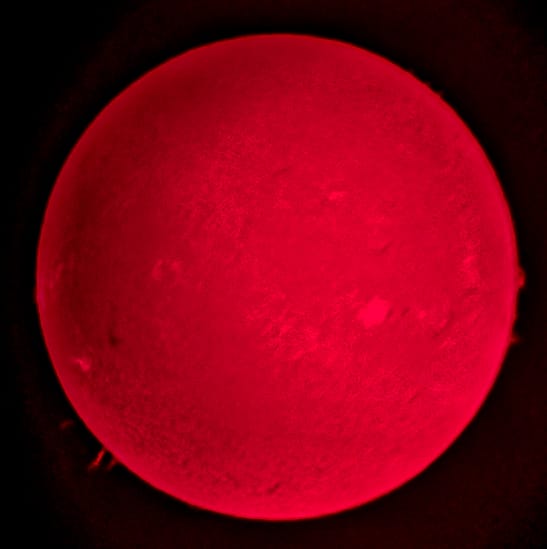 The solar surface. Compiled from two images, one capturing the surface detail of the Sun with a 10 ms exposure and gain of 40, and the other with same exposure but the gain increased to show the prominence on the limb more clearly, effectively overexposing the surface. The two images are then overlaid in Photoshop using the "difference" layer setting, sharpening applied and levels adjusted. Taken with William Optics Z61, Daystar Quark Chromosphere, SharpCap, AutoStakkert2 and processed in Photoshop.