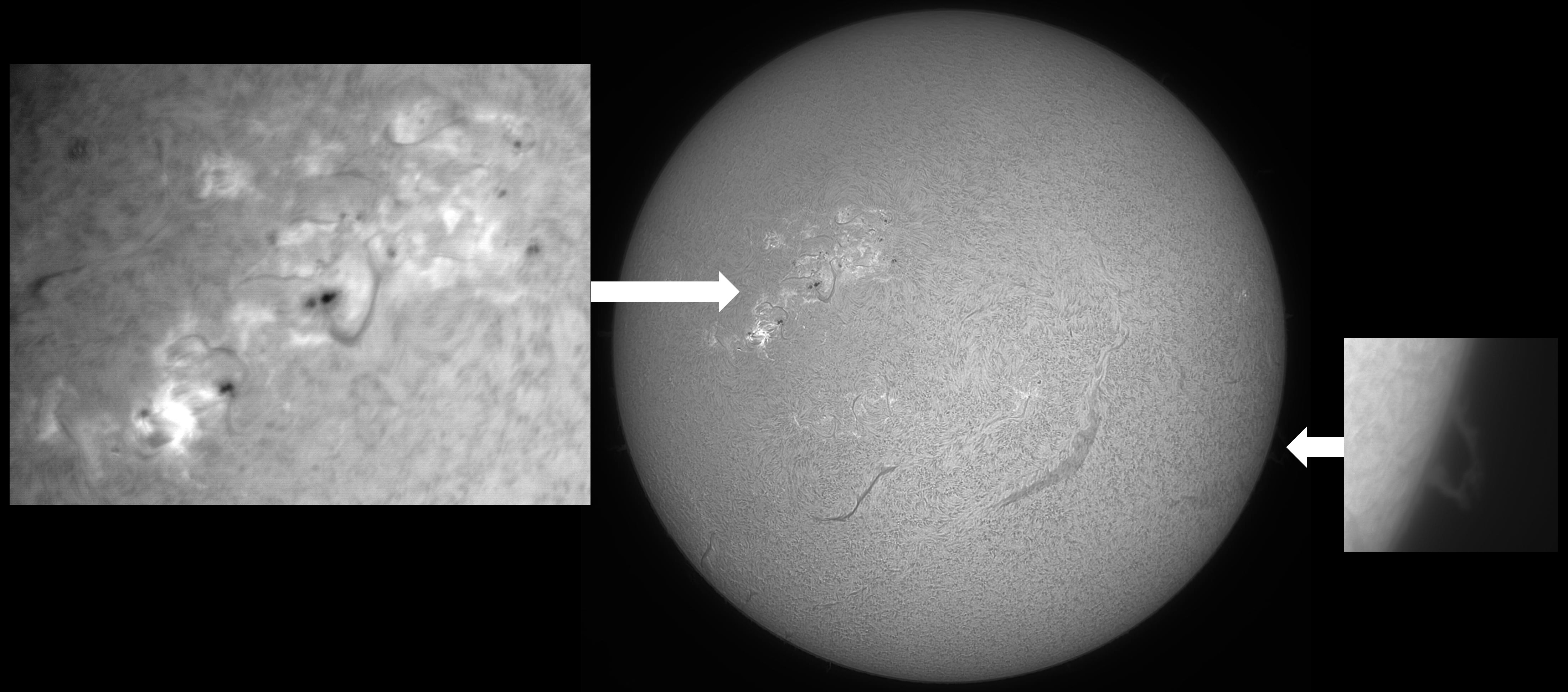 The Sun imaged in white light, with the massive active regions AR13668 and AR13664 and limb prominences. Images captured 09:07-09:23 UT. Widesky 80 mm refractor with Lunt Herschel wedge and polarizing filter mounted on a Sky-Watcher Star Adventurer GTi mount. ZWO ASI178MM camera. The image was captured with Sharpcap, stacked and processed in Autostakkert 4, Registax 6 then further processed in Affinity Photo. The enlarged inset images were captured with the use of a 2.5x Barlow lens.
