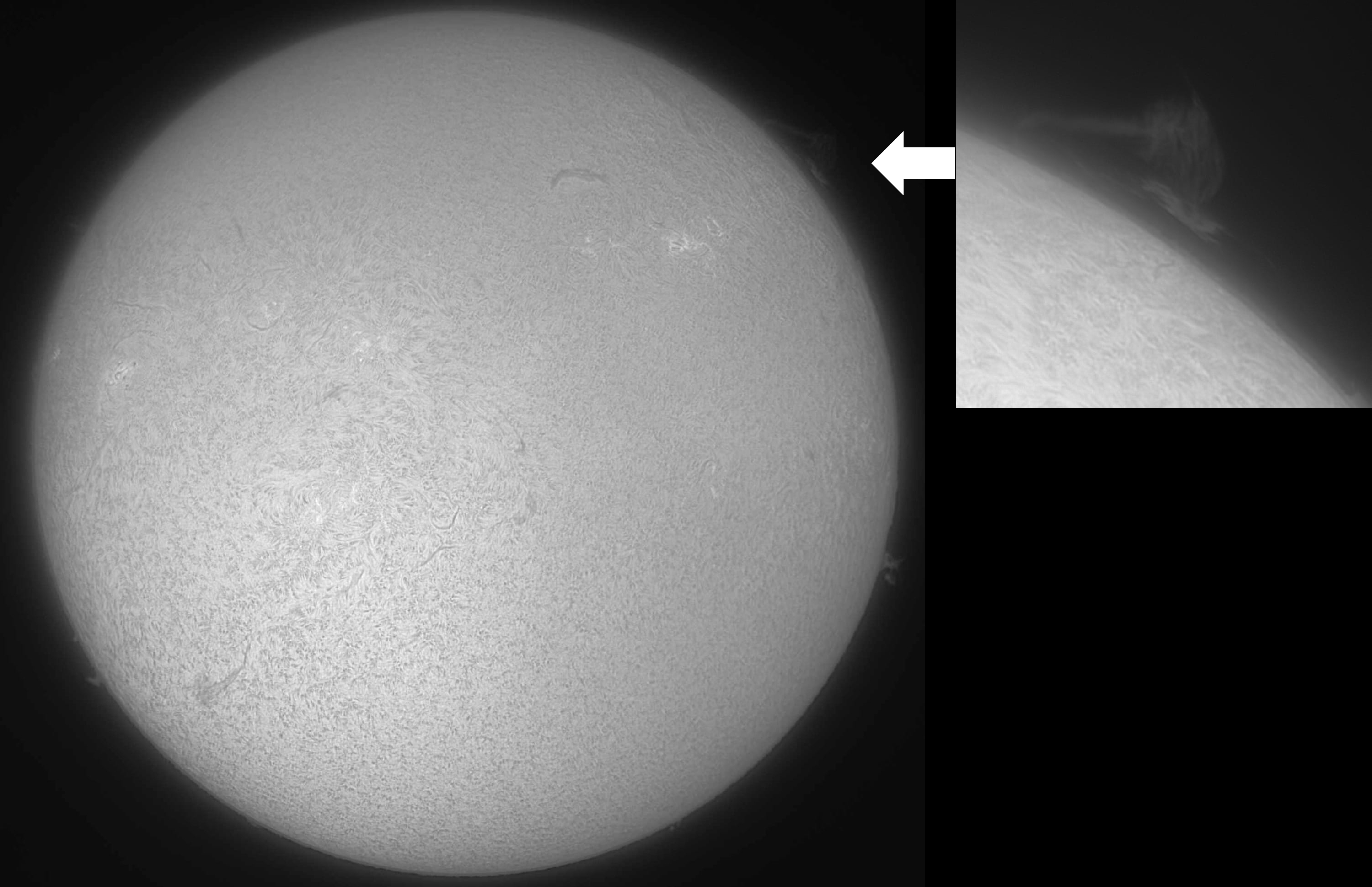 The Sun imaged in Hα light. Lunt LS60THa/B1200 mounted on a Sky-Watcher Star Adventurer GTi mount. ZWO ASI178MM camera. Enlarged inset of a limb prominence captured using a 2.5x Barlow lens.