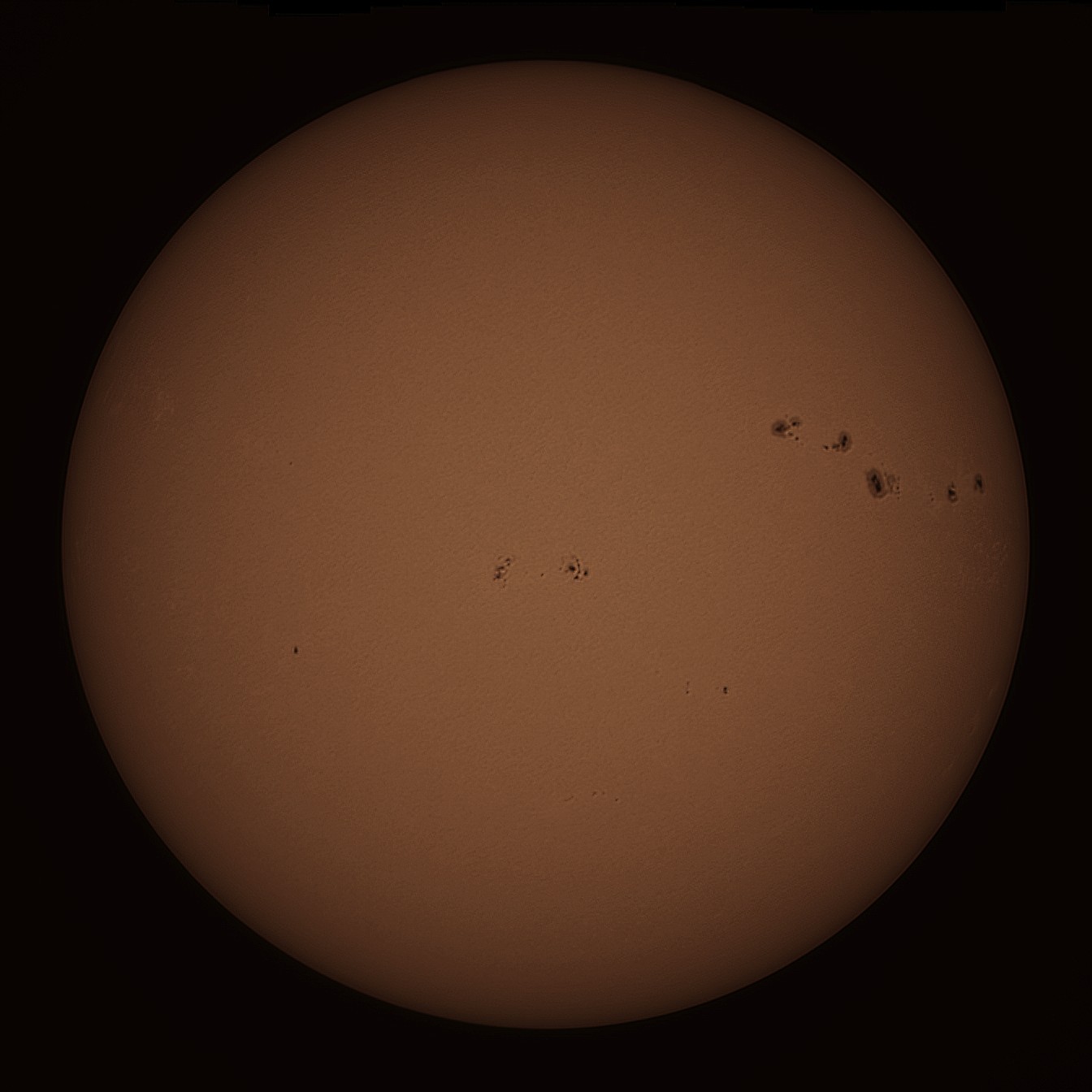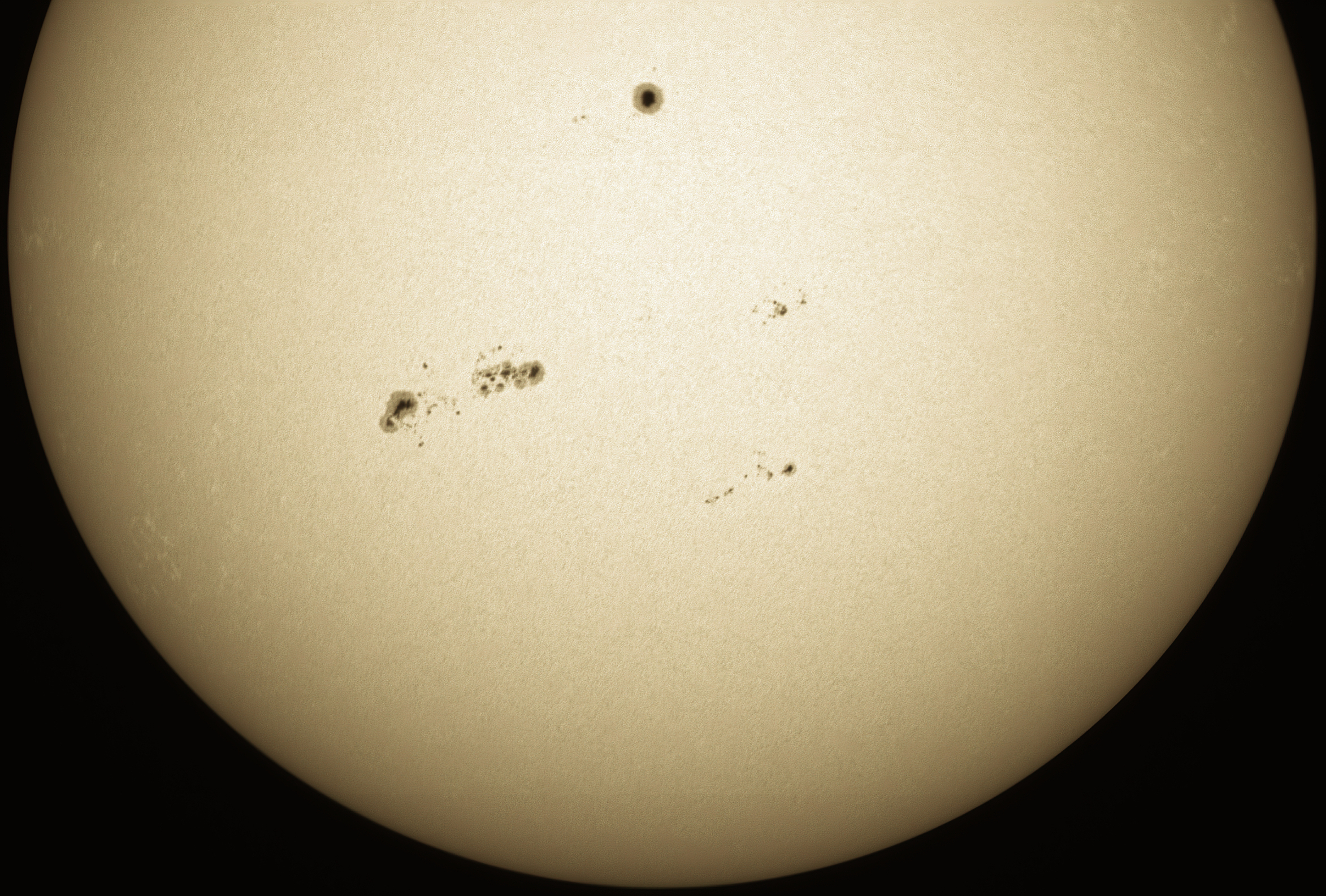 Sunspots in white light. Skywatcher 200PDS Dobsonian, white-light Baader solar filter, 2x Barlow, Canon EOS 500D.