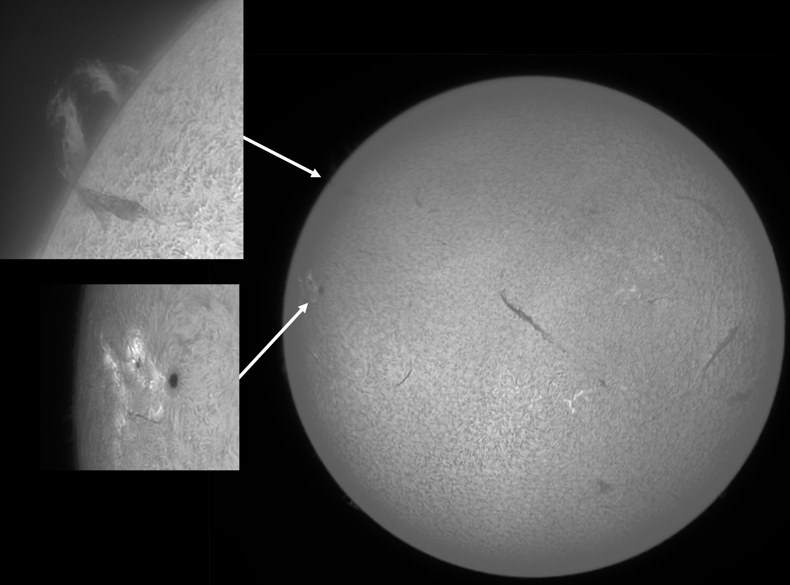 The Sun imaged in Hα light using a Lunt LS60THa/B1200 telescope and ZWO 178mm camera. Composite of images captured between 13:10:48 and 13:17:32 UT. The enlarged insets of the sunspots, filaments and an extraordinarily large prominence were taken using a 2.5x Barlow lens. It was necessary to wait for low clouds to pass before capturing the image, but it was worth the wait!