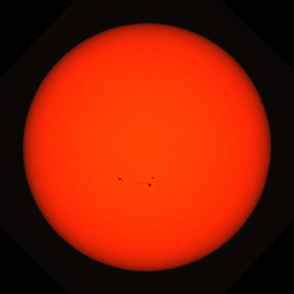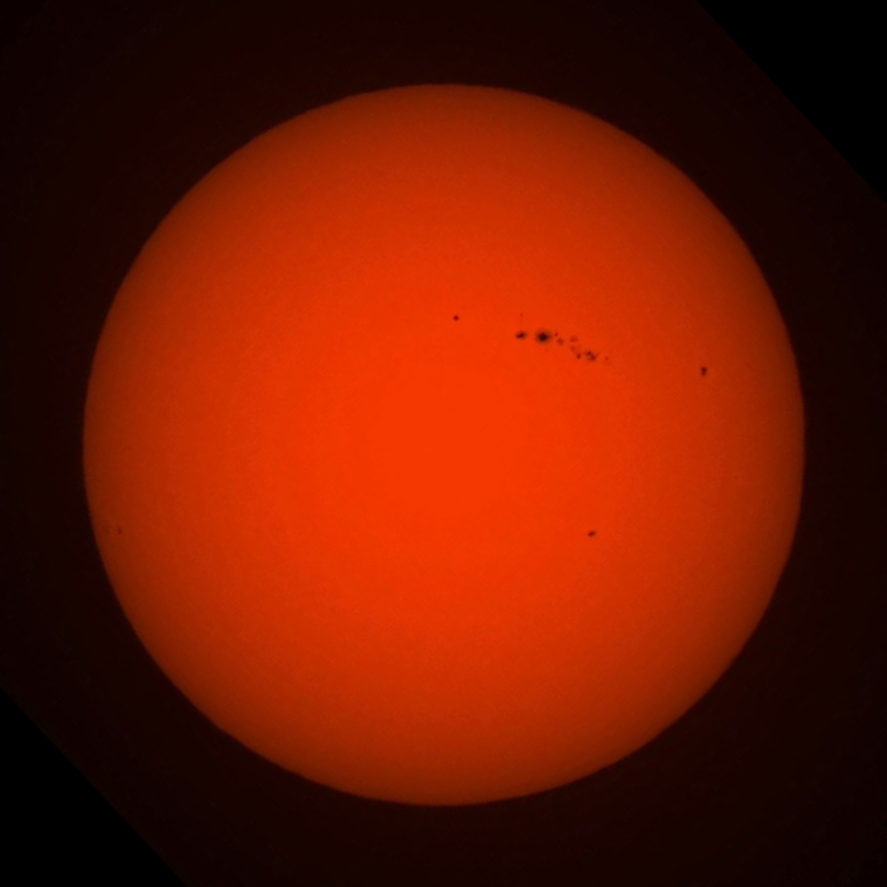 The Sun in white light, with active region AR1944 (visible to the naked eye with a solar filter). The image was taken shortly after sunrise, with the Sun at very low altitude, so suffers from atmospheric distortion. Canon 550D with 500 mm Tamron lens.