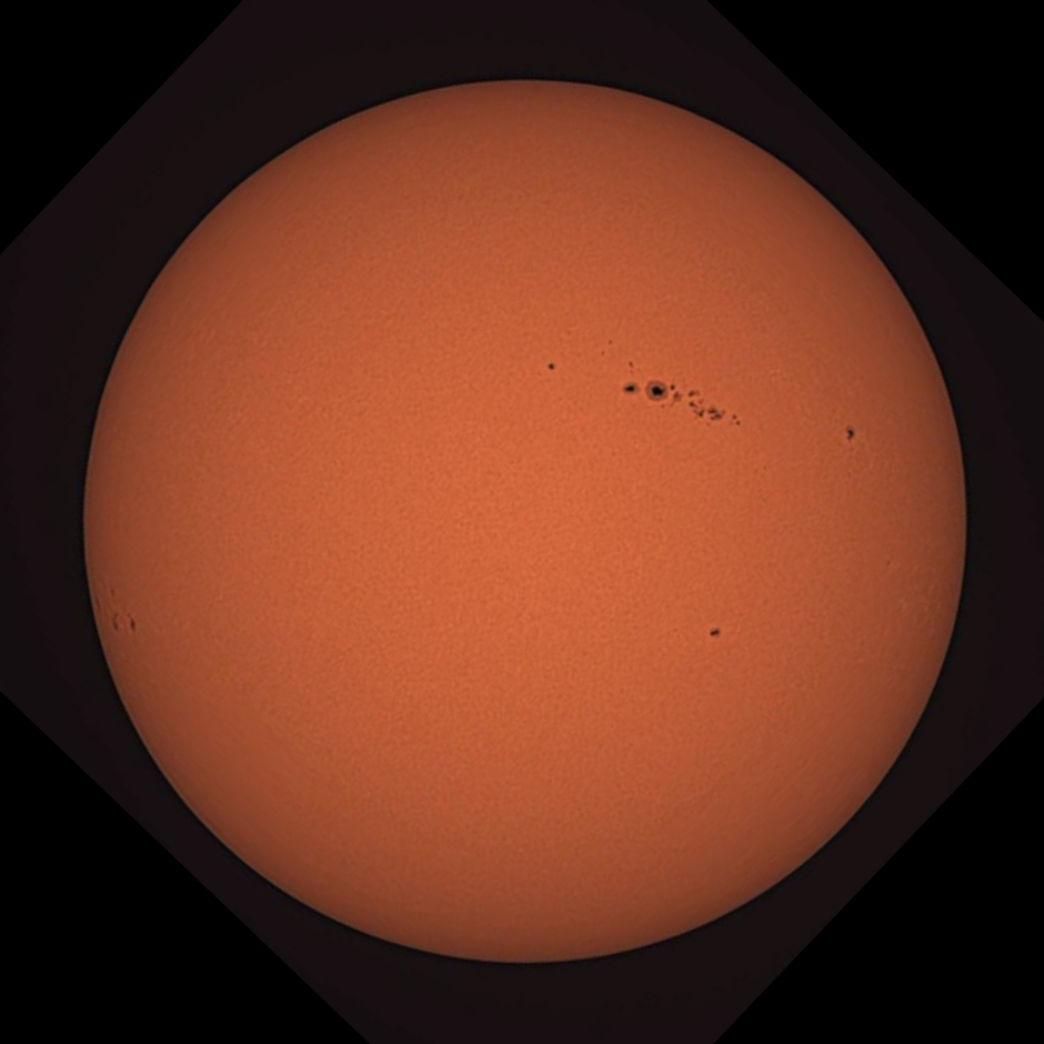 The Sun in white light. William Optics ZS71 ED 71 mm, f/5.9 refractor on NEQ6 mount. Orion white light filter. Altair GPCAM v2 IMX224 camera. Image taken 10 minutes after the below one.