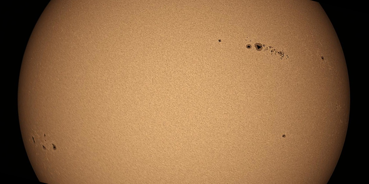 The Sun imaged in white light with OASI's new Widesky 80 mm refractor, Lunt Herschel wedge and a ZWO ASI178MC camera. The image was captured with Sharpcap, stacked and processed in Autostakkert 3 and Registax 6. Several active regions are visible.