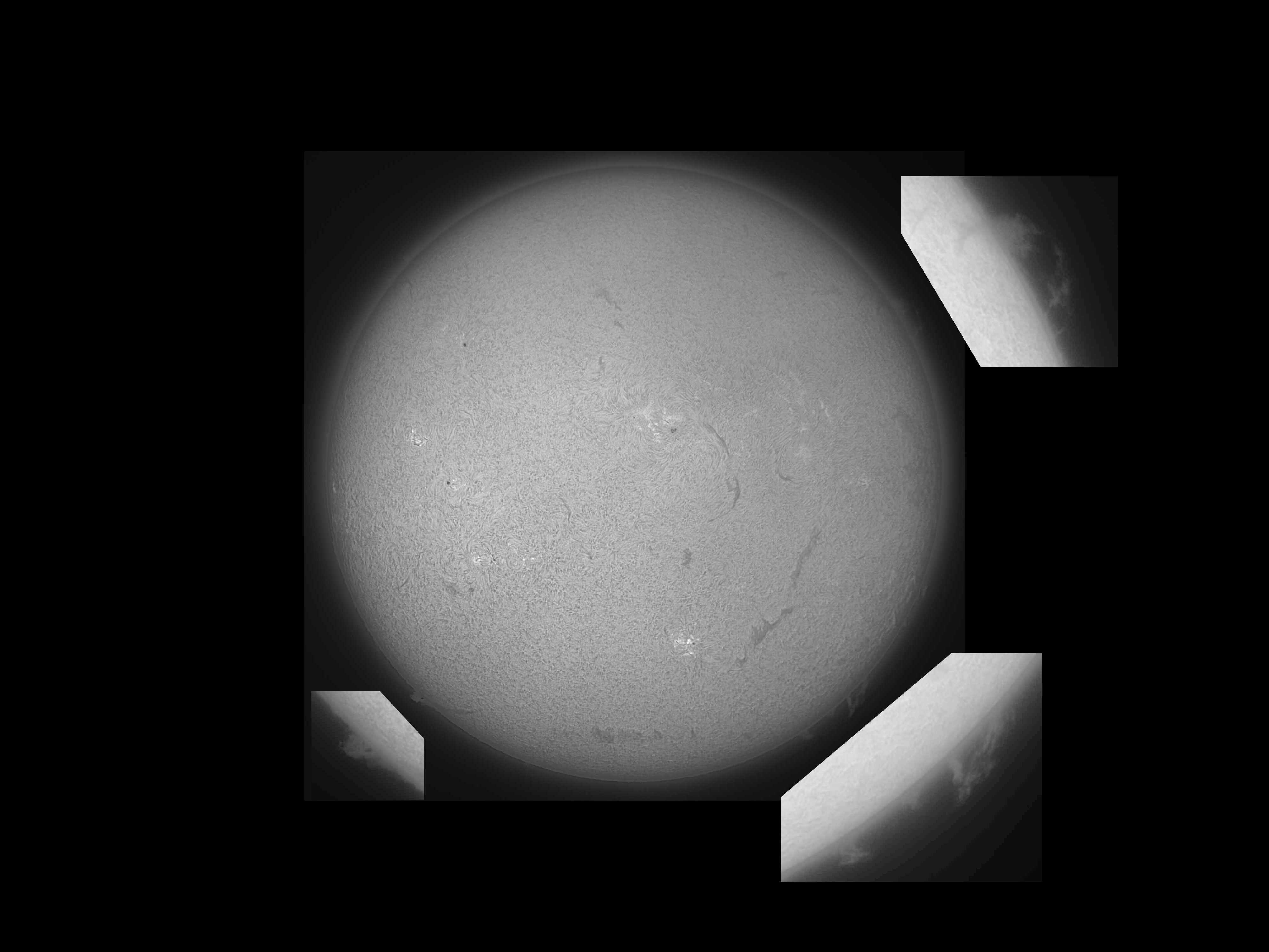 A montage of solar images in Hα light. Seeing conditions were excellent. The central image is an eight-pane mosaic and the surrounding monochrome images show detail of active regions and/or on the limb. Some of the monochrome images are "true colour" others are inverted as follows: east (left) top image true colour, lower inverted; north (top) inverted; west (centre right) true colour; south-west (lower right) inverted. Equipment: Lunt LS60Tha/B1200/CPT solar telescope with Lunt 60 mm front-mount double stack Hα etalon filter; Altair 3x tele-extender Barlow lens; ZWO ASI174mm camera; Sky-Watcher EQ6R-Pro mount. Processed with: SharpCap Pro, AutoStakkert4!, ImPPG, PixInsight and Affinity Photo.