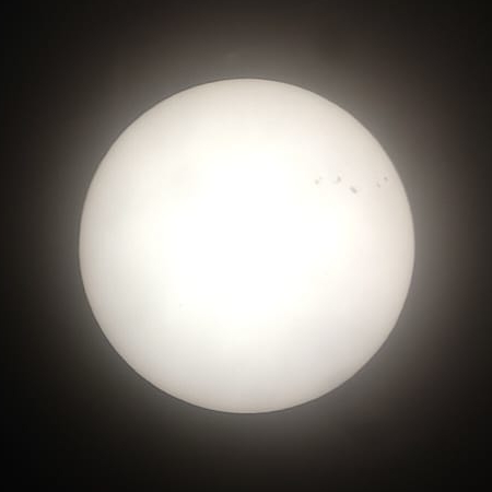 The Sun in white light with sunspot group AR1476. Celestron C90 spotting scope with Baader AstroSolar Film and Meade 26 mm eyepiece (48x magnification). Hand-held Lumix compact camera.