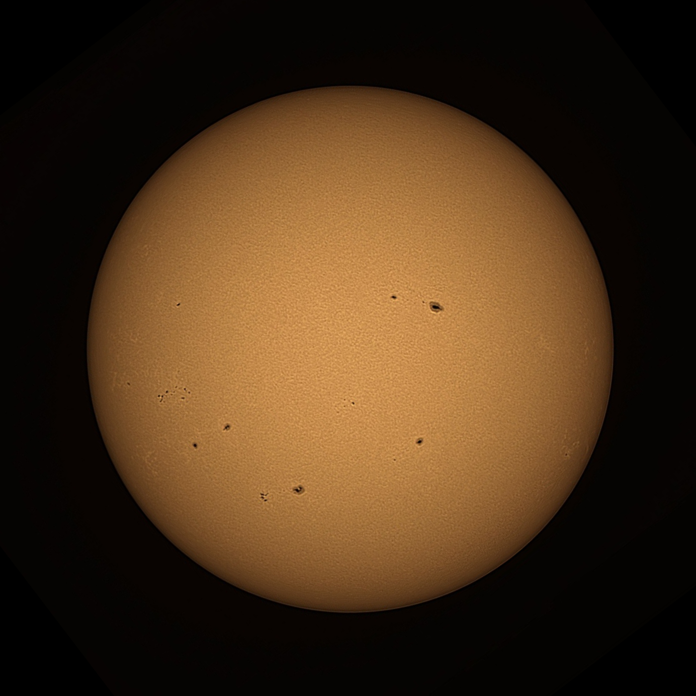 Sunspots in white light. Skywatcher 200PDS Dobsonian, 2x Barlow, Baader solar filter, Canon EOS 500D.