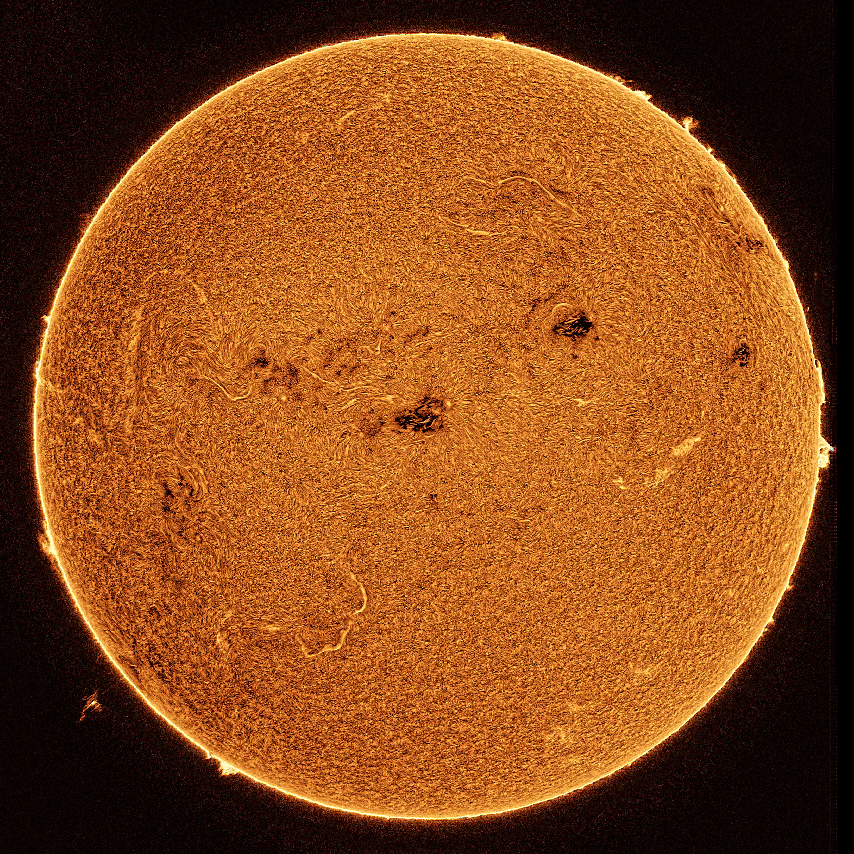 The solar disk in Hα light is dominated by the massive active regions AR13668 and AR13664. An inverted image shows also a large prominence on the SW limb. Equipment: Lunt LS60Tha/B1200/CPT solar telescope with Lunt 60 mm front-mount double stack Hα etalon filter; Altair 3x tele-extender Barlow lens; ZWO ASI174mm camera; Sky-Watcher EQ6R-Pro mount. Exposure time 8 ms (124 fps), camera gain 300. 200 frames stacked from 2000. Processed with: SharpCap Pro, AutoStakkert4!, ImPPG, PixInsight and Affinity Photo.
