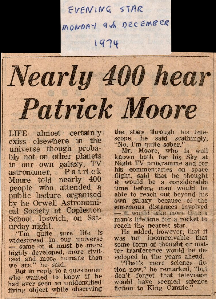 On arriving at the school, private worries that any of the organisers might have harboured about low attendance were immediately dispelled as the hall was packed to capacity (530 people). Roy Cheesman provided an introduction and then Patrick delivered the evening lecture, entitled Into Space, in his own inimitable manner, holding the audience entranced for one hour and ten minutes. His humorous tales, accompanied by slides depicting Man's early attempts to venture into space amazed and captured the imagination of everybody present. After the lecture Patrick signed some 200 autographs, then we had coffee with Miss Beeson, headmistress of the school. At about 9.30pm we cursed the clouds which prevented a return visit to the Observatory to look through the telescope and Patrick started the long trek back to his home at Selsey.