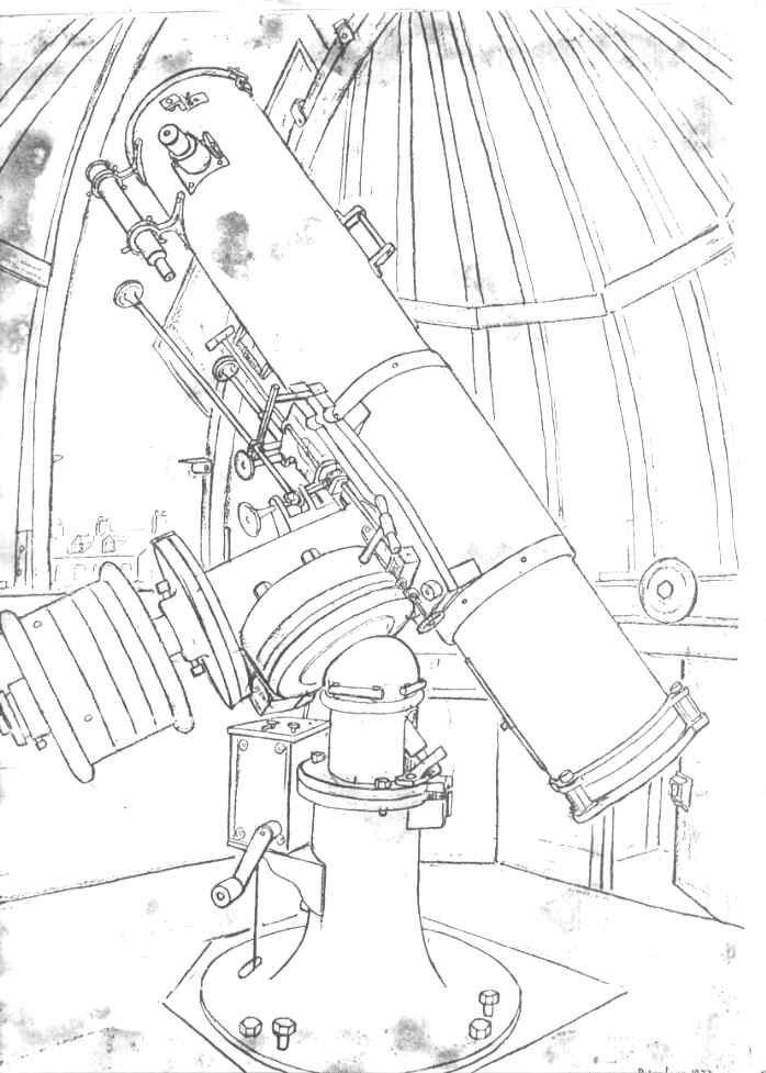 The 12" Calver Reflector is on a capstan style mount. The instrument was in the ownership of a Mr Albright from about 1920. During the 1950s he obtained permission to have it housed in a small observatory in, of all unlikely places, Edgebaston Waterworks! After Mr Albright's death the instrument passed to the Birmingham Astronomical Society and was regularly used. In the early 1980s, however, they had to vacate their watery base because of re-development and the instrument was sold to persons unknown.