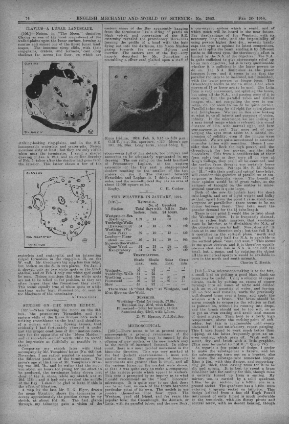 Issue 2552, 20 February 1914, p. 74. Clavius - A Lunar Landscape. Cook describes the crater Clavius. Includes drawings made on 05 January and 05 February 1914.