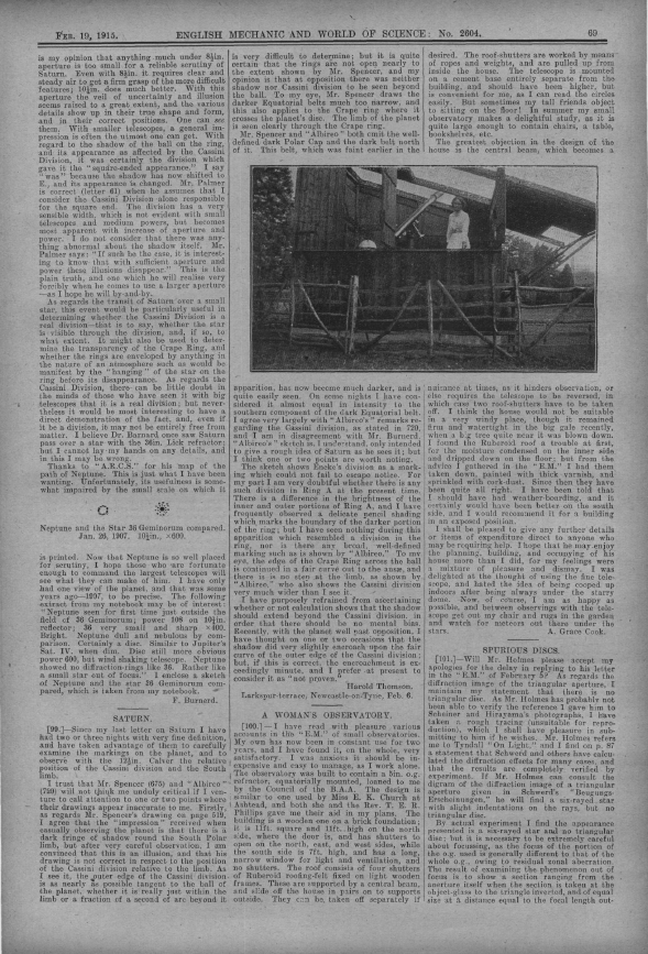 Issue 2604, 19 February 1915, p. 69. A Woman's Observatory. Cook describes her observatory, which has been in use for two years, as inexpensive and easy to manage. The construction is 11 feet square and 11 feet high at its highest. Shutters in the roof slide off to permit observations. She worked alone with an equatorially mounted 5" refractor [1] loaned to her by the BAA. The telescope is mounted on a cement base separate from the building.