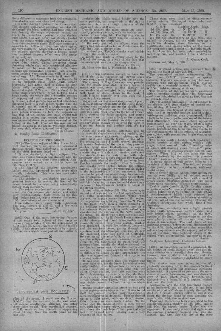 Issue 2877, 14 May 1920, p. 190. Eclipse of the Moon. Cook observed the lunar eclipse of 02 May 1920 from Orwell Park with the 10" refractor. During the eclipse, she timed occultations of three stars of magnitudes 10-12. After the eclipse, she watched for Aquarid meteors until sunrise but, disappointingly, only recorded one.