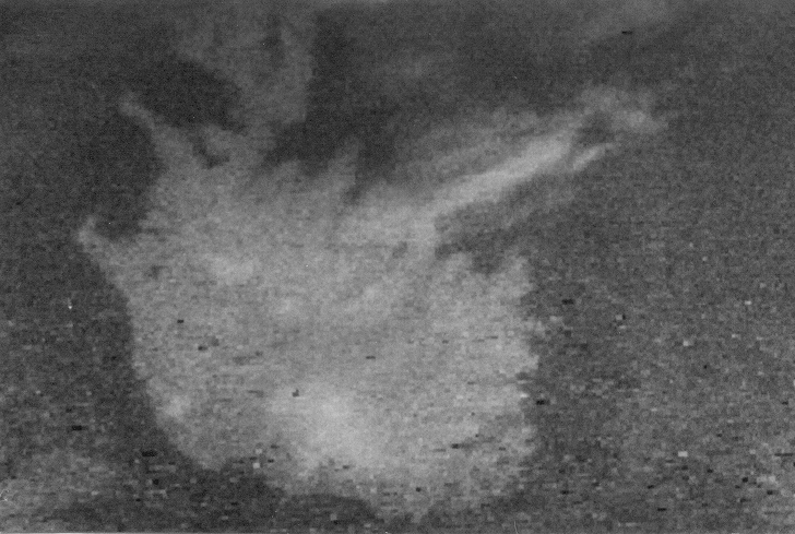 The satellites transmit in two different modes. The first is APT (Automatic Picture Transmission) which means that the satellite transmits continuously an image of what is directly below it. In this mode the picture builds up on the computer screen line by line at two lines per second. If the satellite is flying from south to north the picture comes out upside down, and if it's a Meteor imaging in infra red the picture is effectively a negative so identifying the geography on a cloudy day is often difficult! In APT the resolution on the ground is approximately 5 km which is fine for general cloud patterns and coastal outlines as can be seen from the images below.