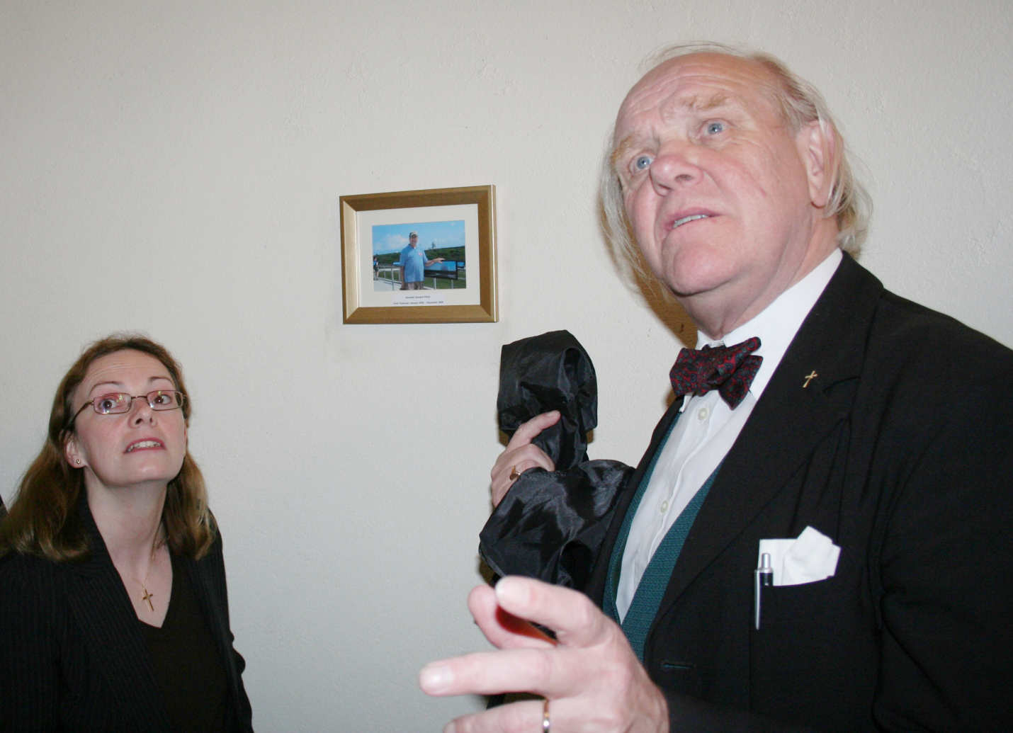 Allan recalled an evening reception he'd attended where several eminent brain surgeons were present. They had consumed copious quantities of red wine. After a few glasses (or was it bottles?) Allan started discussing brain surgery with one of the surgeons. Apparently, brain surgery was akin to drilling a hole in someone's head, inserting a whisk and whisking the contents! It was shortly after then I recall Peter (or was it Allan?) saying "We seem to be going round in circles, I'd better shut up!" Fortunately we arrived in time for the meeting as otherwise we may have ended up in Edinburgh. After the meeting Allan unveiled a portrait of the late Ken Goward, former Chairman of OASI, in the observatory spiral staircase. Ken's widow Lorraine and his brother were present.