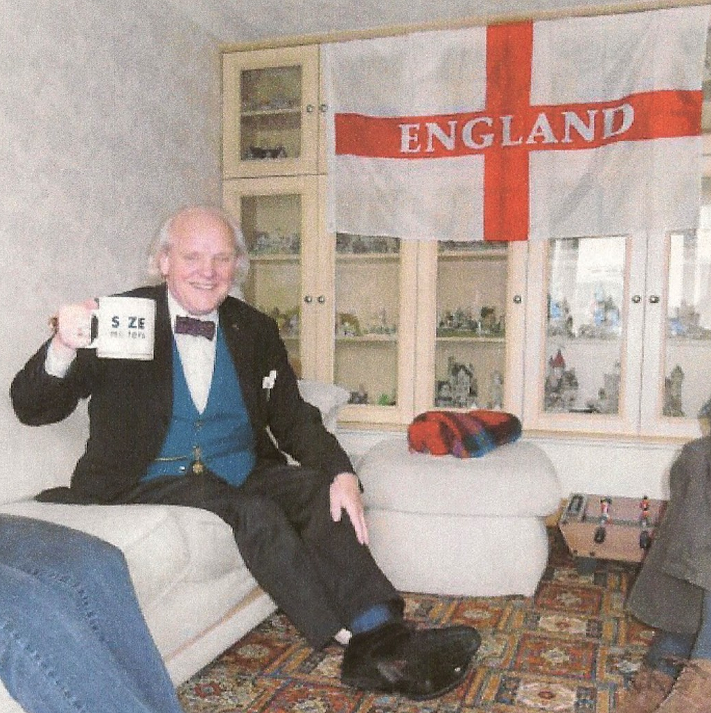The following day, I picked Allan up from the Courtyard Marriot hotel and gave him a lift to Tuddenham Churchyard to lay a wreath on Ken Goward's grave. Lorraine, Ken's widow, Ken's brother and several members of OASI, including Paul Whiting, Gary Coleman, Tina and Lyndsay Hammond, attended. Afterwards we were invited to Ken's home where Lorraine served Allan a never-ending supply of industrial strength tea in the largest mug I had ever seen. In Allan's case, when it comes to tea, "Size Definitely Matters!" Allan referred to the vessel as a bucket and said he could almost disappear inside it!