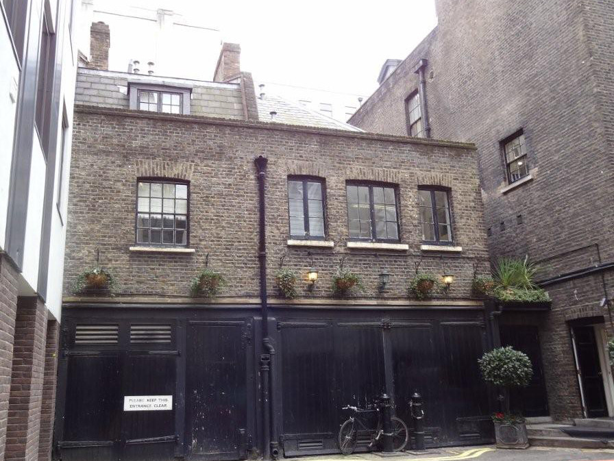 A short distance from his London residence, Tomline rented stables in Wells Street and Babmaes Mews (off Jermyn Street), collectively known as East Stable Yards. (In 1937, Wells Street was renamed Babmaes Street.) The stables were extensive and placed very conveniently for London's most fashionable locations. Nowadays, very little is left of the buildings, however, a sense of their extent can be gained from nearby West Stable Yards, nowadays used as garages. (Photos of the premises below are by Tina Hammond in 2013.)