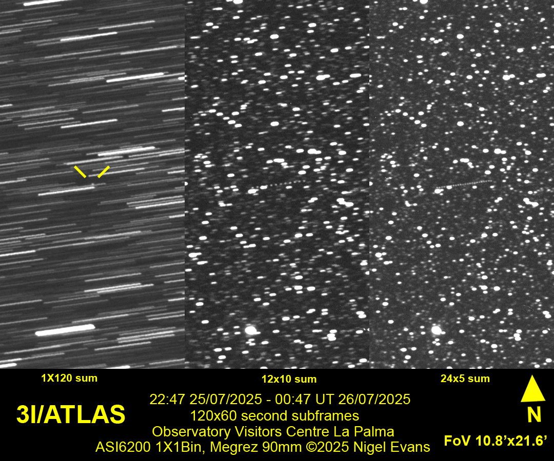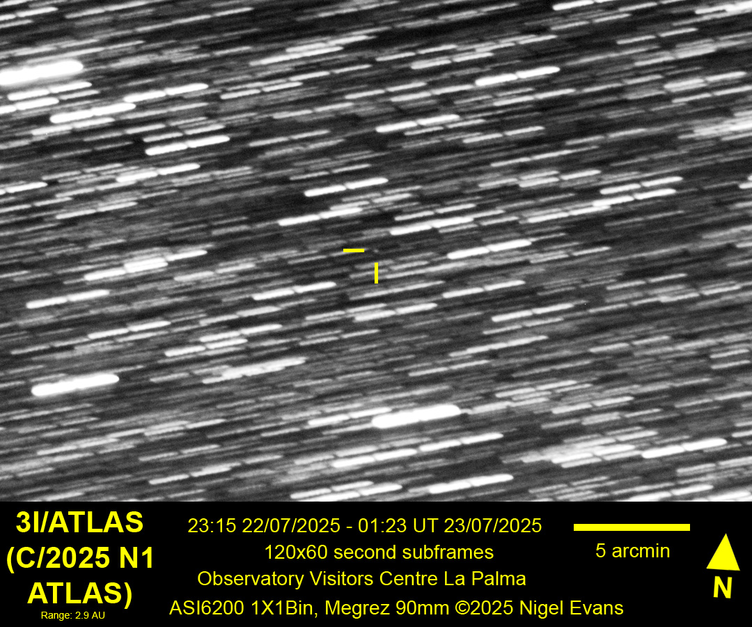 The ATLAS (Asteroid Terrestrial-impact Last Alert System) survey telescope in Rio Hurtado, Chile, first reported an observation of comet 3I/ATLAS on 01 July 2025. (Subsequently, "pre-discovery" observations were found as far back as 14 June.) The object is the third known interstellar visitor to the Solar System (following 1I/Oumuamua and 2I/Borisov) and is a little different to its predecessors. The first two were predominantly rocky or asteroidal, whereas 3I/ATLAS is more gassy or comet-like. As it draws nearer to the Sun it is expected to develop a tail, but it is unclear whether the tail will be bright enough to appear in a modest telescope. The object is expected to attain peak magnitude around the end of November 2025 (fortuitously, this coincides with the best time to view it from the UK), and predictions of its peak magnitude have ranged from an initial estimate of 11.5 to an estimate in late summer of 14.5.