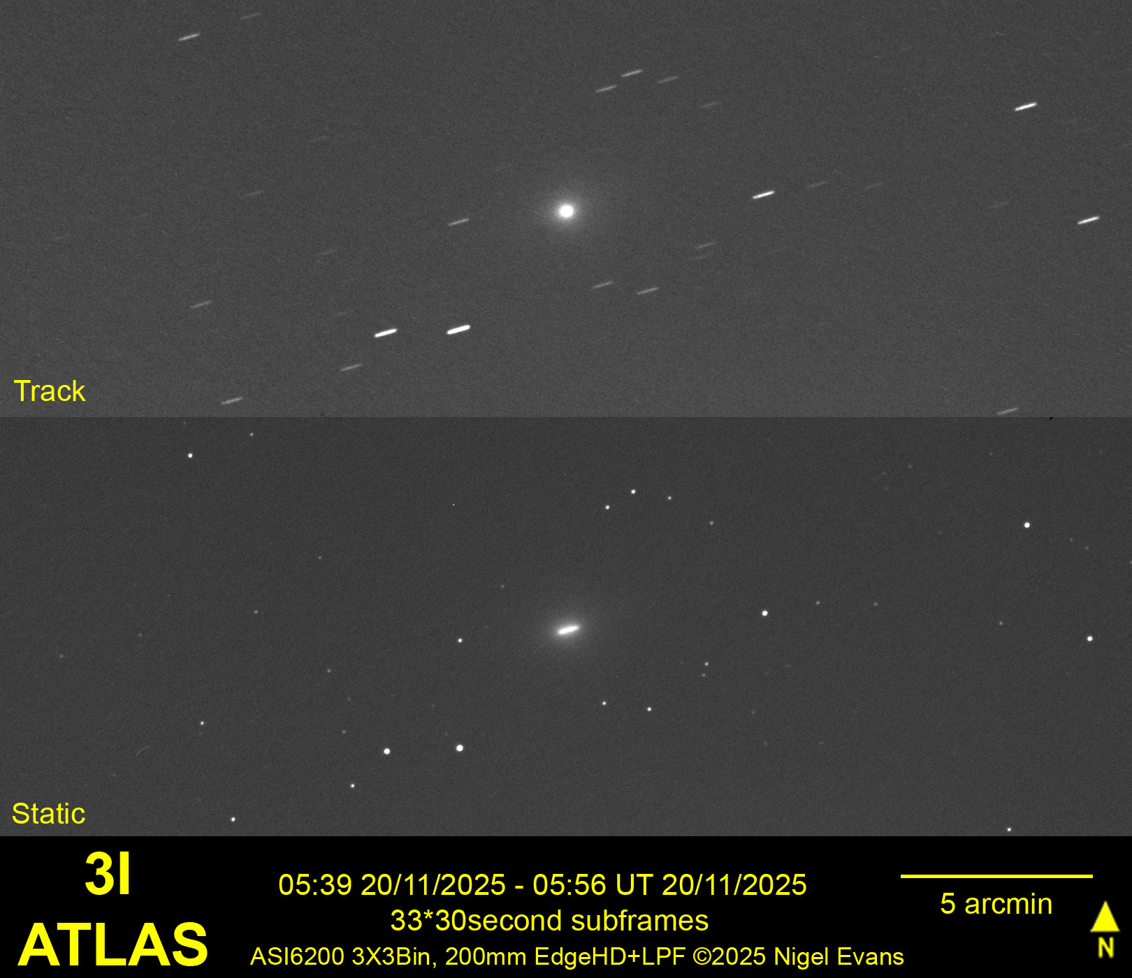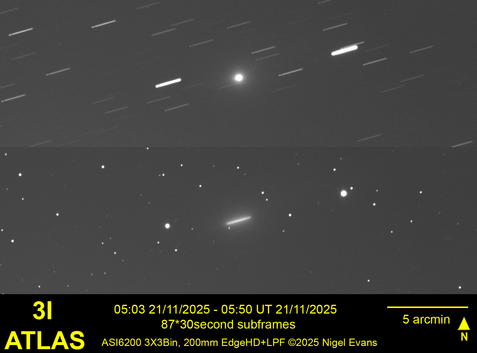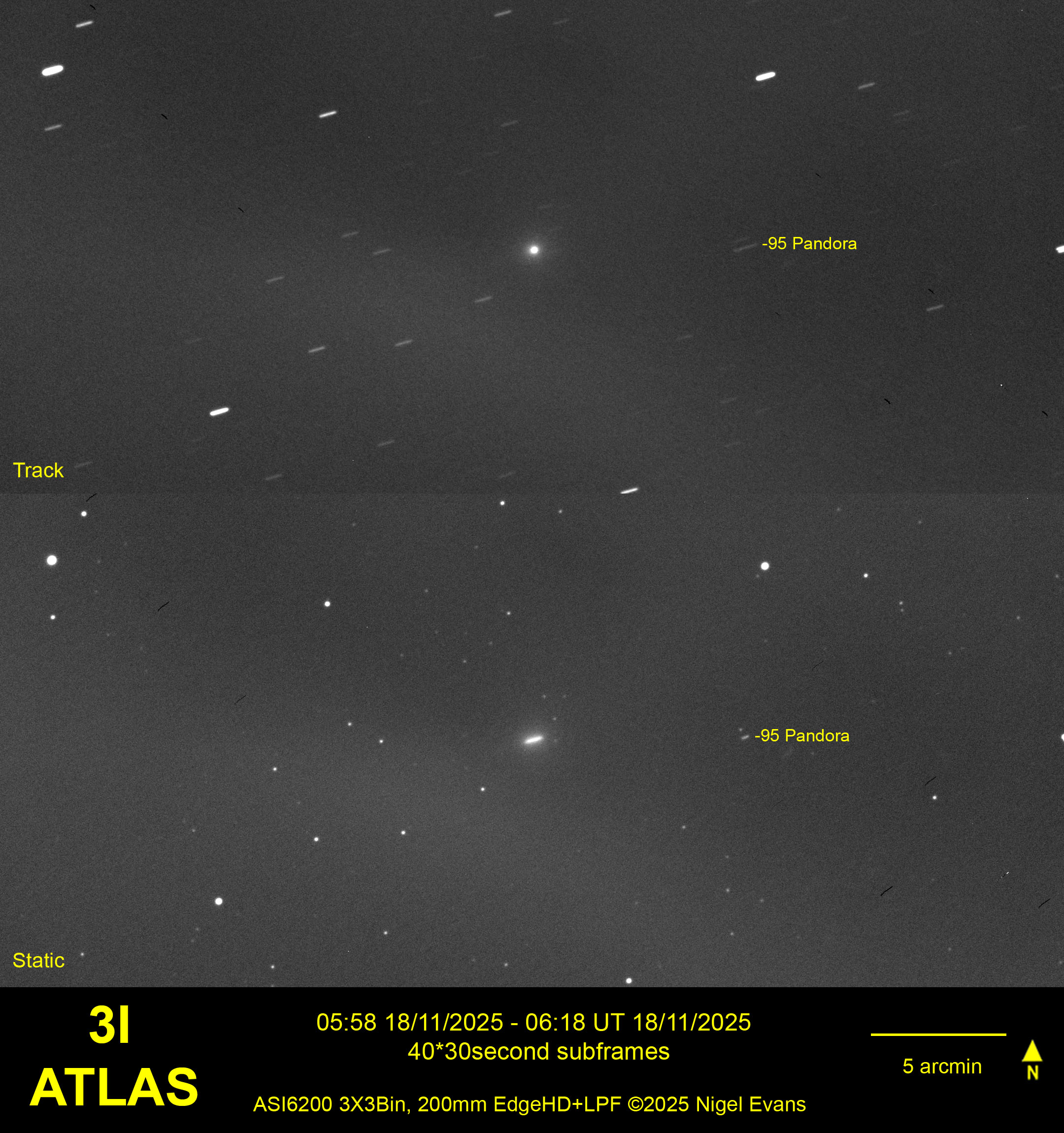 After much dismal weather recently, the morning of 18 November was clear and very cold! From my home observatory, the comet was visible in the twilight sky. Although it was approximately 100 times brighter than when I last observed it from La Palma in July, I did not expect to capture any detail of the tail that observers situated under dark skies have reported. The image below also captures asteroid 95 Pandora, moving across the sky in the opposite direction to 3I.