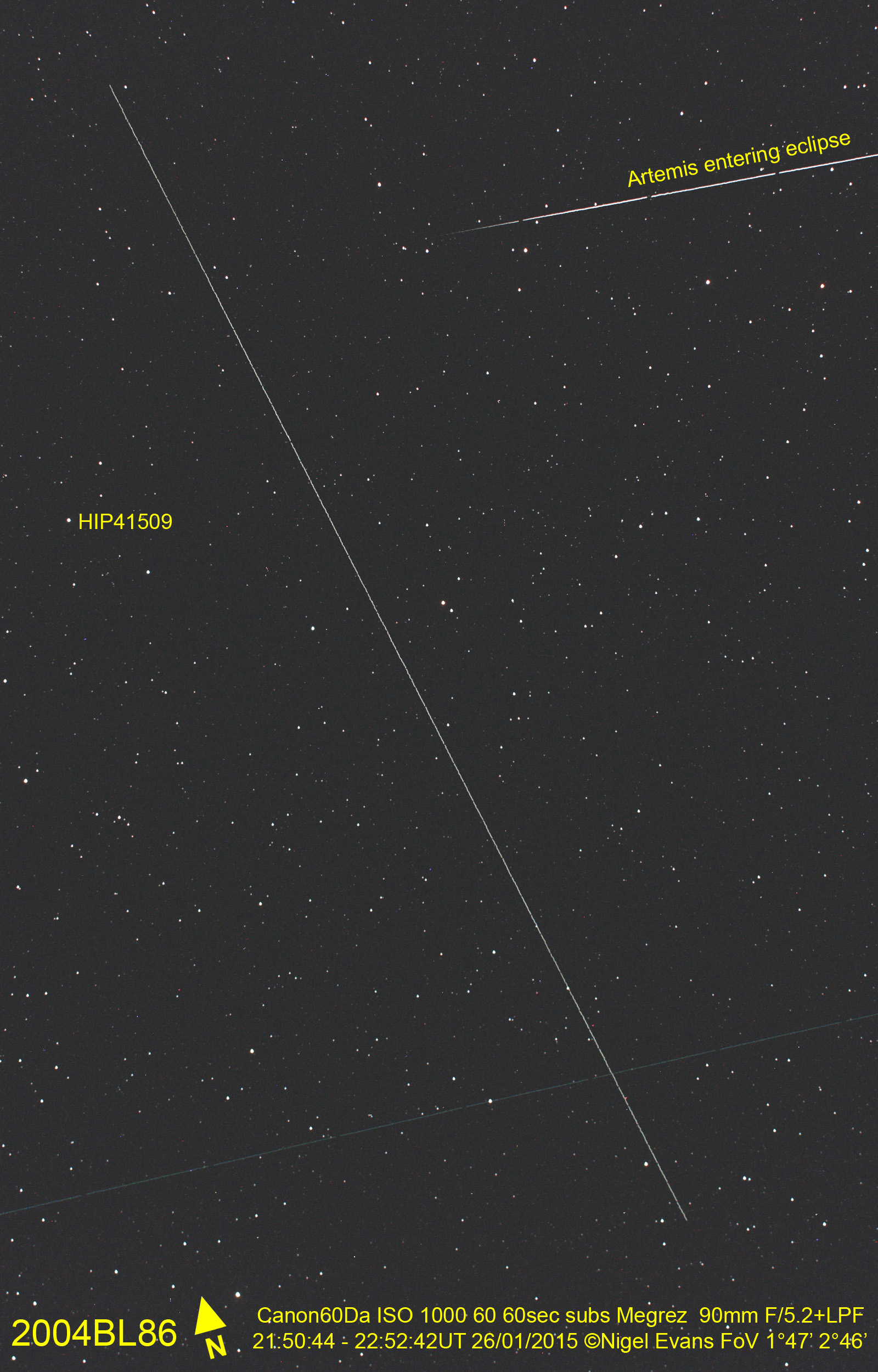 The track of 2004 BL86 is from bottom right to top left. Running from top right to top left is the track of asteroid 105 Artemis, entering eclipse and becoming invisible. The track from lower right to lower left is created by an unidentified geostationary satellite.