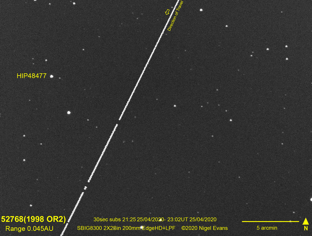 Near Earth asteroid (52768) 1998 OR2 passed about 6.3 million km from the Earth on 29 April 2020. The object is potentially hazardous on a timescale of thousands of years and is notable for its large size, at over 2 km diameter. On 25 April I imaged it in Sextans, at magnitude 11, moving south at over 14 arcminutes per hour (7 arcseconds in each 30 second exposure).