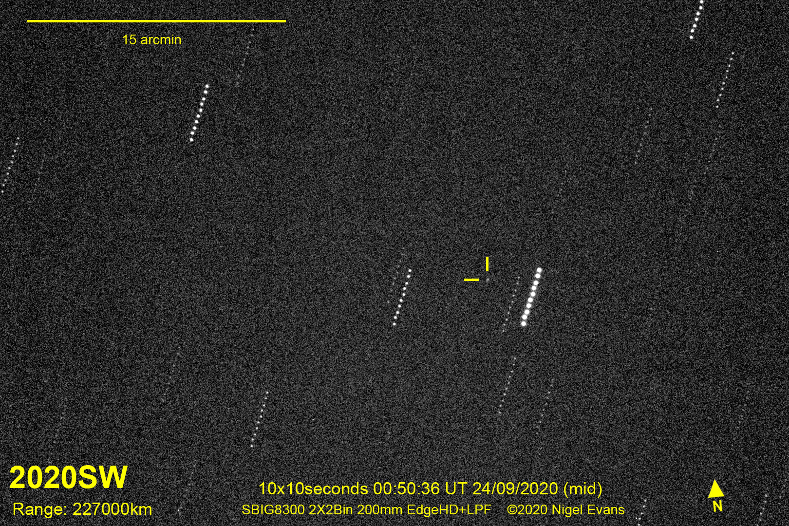 The object was too faint to be recorded in a single frame so I had to apply some processing to make it visible. The following composite image is a stack of ten 10 s frames, offset relative to one another by the motion of 2020SW, then added. Because of the rapid motion of the object, all stars appear 10 times.
