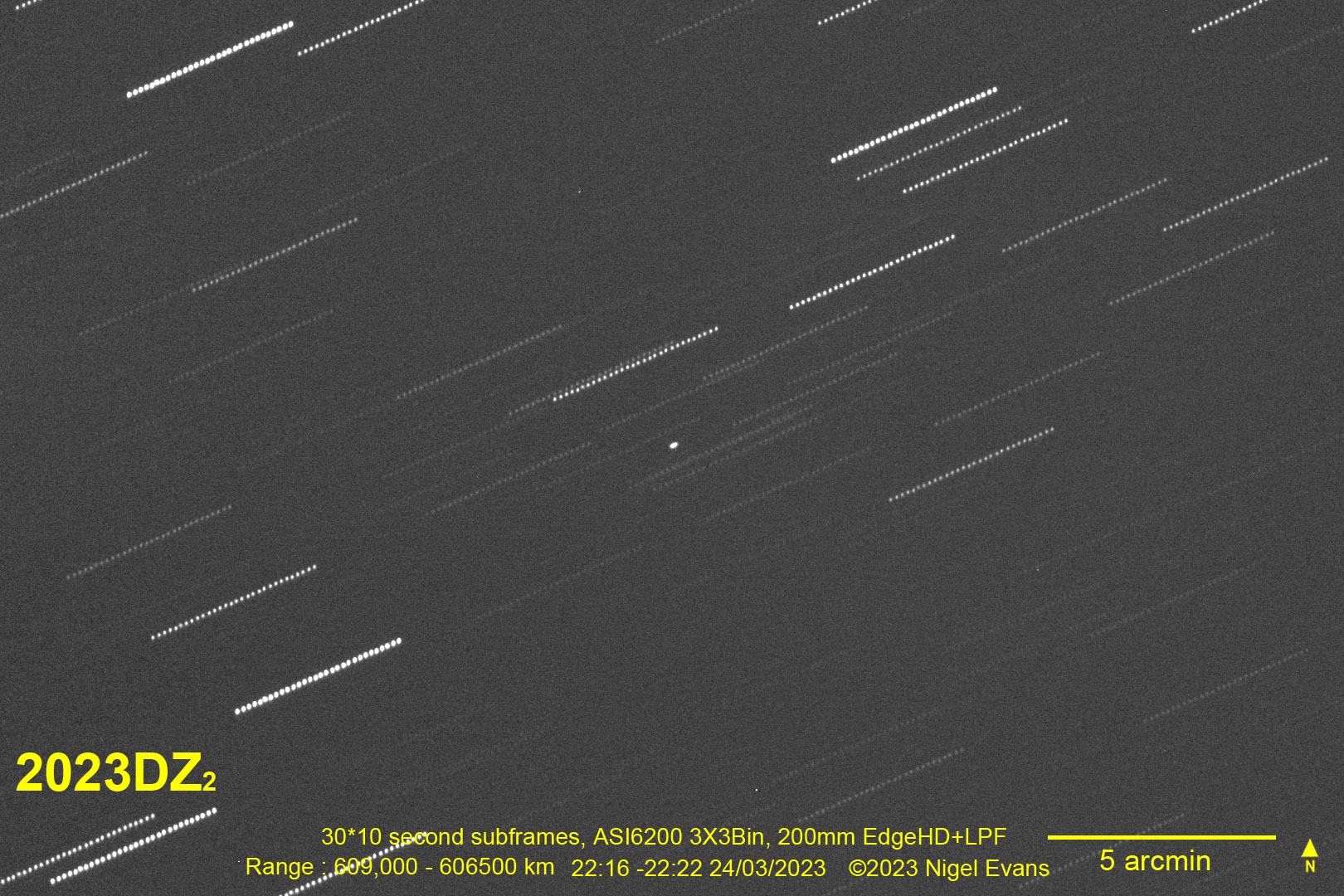 Less dramatically, 2023 DZ2 passed Earth on 25 March 2023 at a distance of 175,000 km. It was not visible from the UK on the date of closest approach, but was visible on the previous night, at a distance of some 600,000 km, at magnitude 14. Its angular velocity was 40 arcseconds/minute, requiring short exposures to arrest its motion.