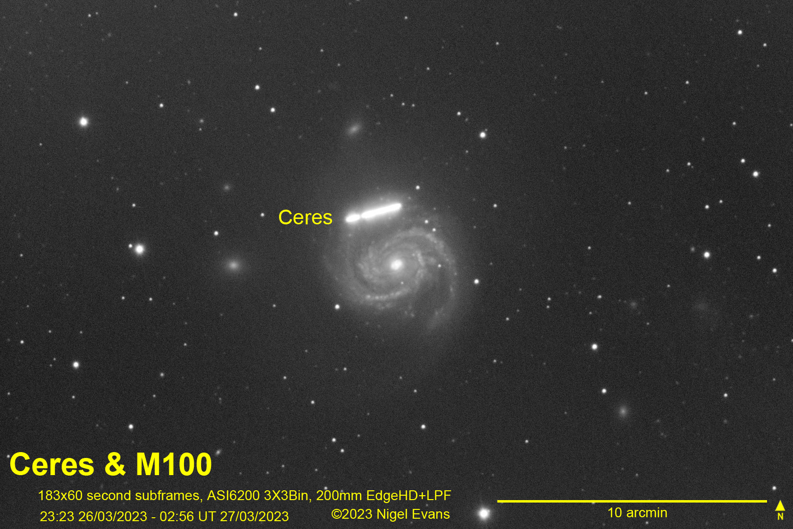 Astronomy magazines highlighted that Ceres, the largest dwarf planet, would pass in front of the galaxy M100 on the night of 26-27 March 2023, creating a photo opportunity.