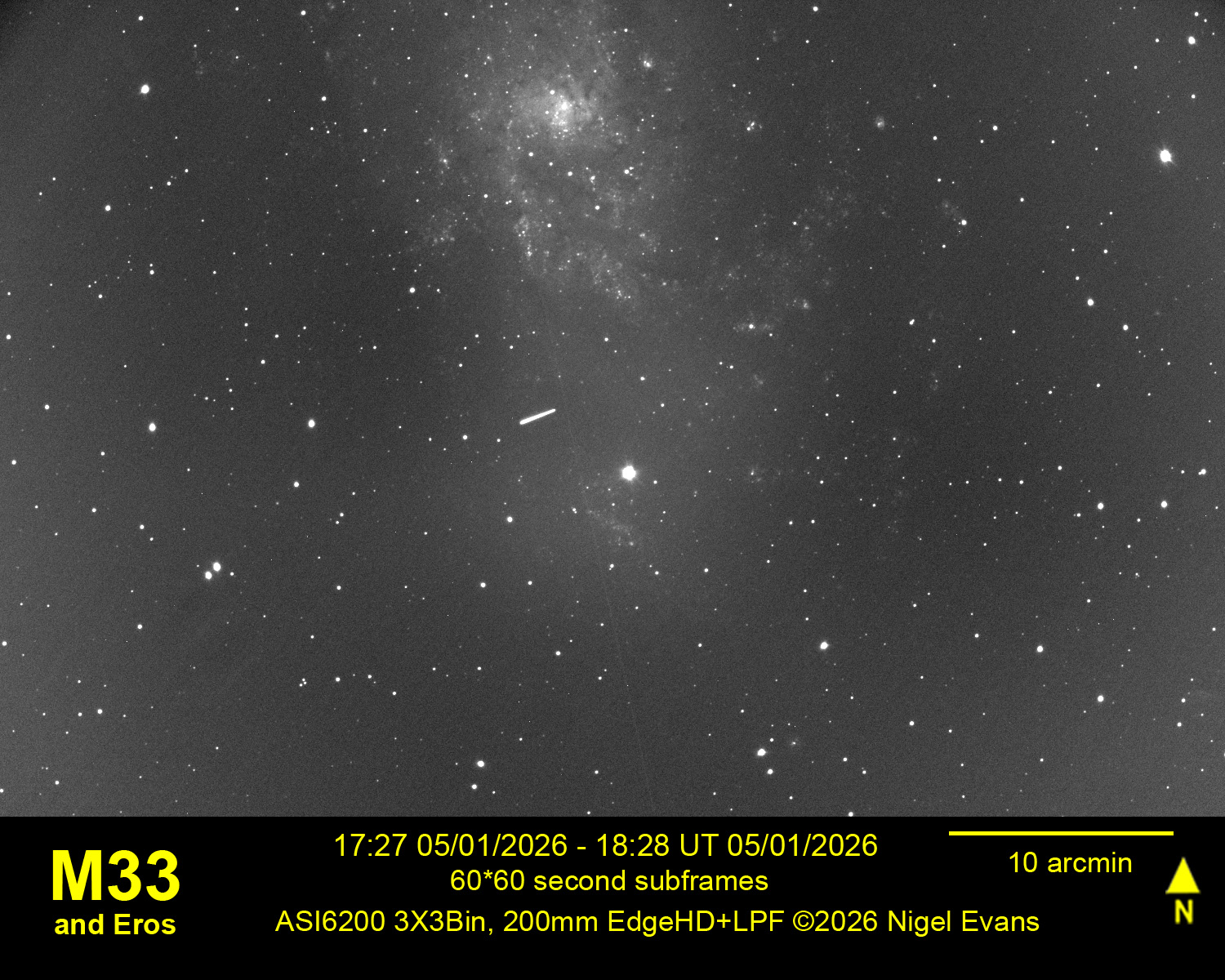 On 05 January 2026, asteroid 433 Eros (magnitude 10.8) swept past M33, the Triangulum Galaxy. I was alerted to the event by a piece on the BAA website. I started observing as soon as it was dark enough and followed Eros until its meridian crossing, at which point clouds rolled in!