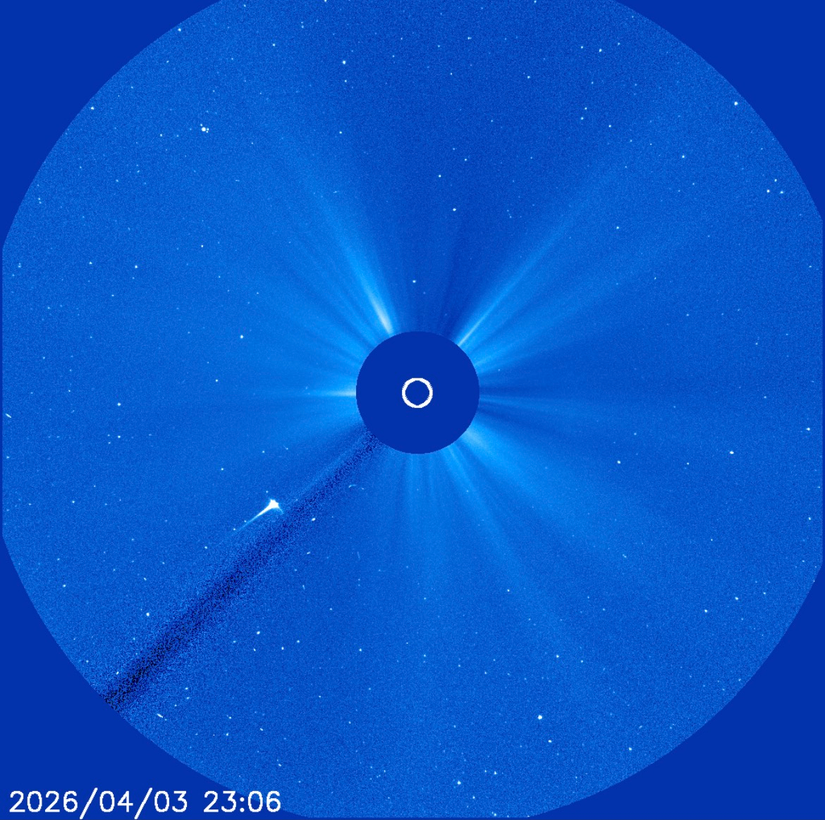 Alternatively, you can access images from the LASCO C3 coronograph aboard the SOHO spacecraft (see below for an explanation of abbreviations) via the SOHO website or smartphone app. The instrument showed the comet at 23:06 UT on 03 April, on approach to perihelion: see below image, which suggests that the magnitude of the comet is circa -2, brighter than Saturn (magnitude 0.9, the planet has just left the field of view of the coronograph following solar conjunction), but not as bright as Venus (magnitude -3.9).