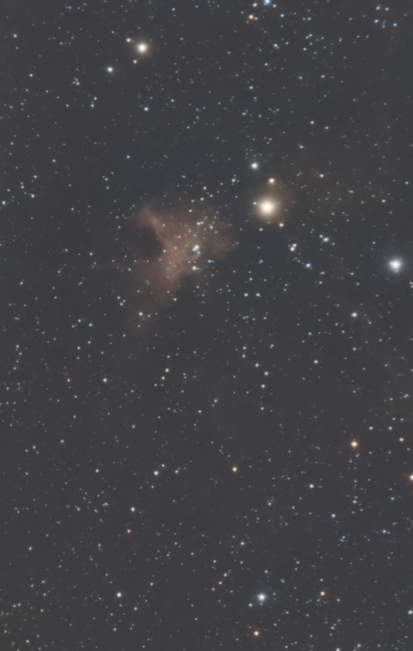 Skywatcher 200PDS 200 mm, f/5 Newtonian on NEQ6 mount with Canon 60Da camera. Fifteen 480 s exposures at ISO 400. The nebula is 30 LY in diameter and lies at a distance of 15,000 LY in Canis Major. It was at low altitude to the south when I captured this image.